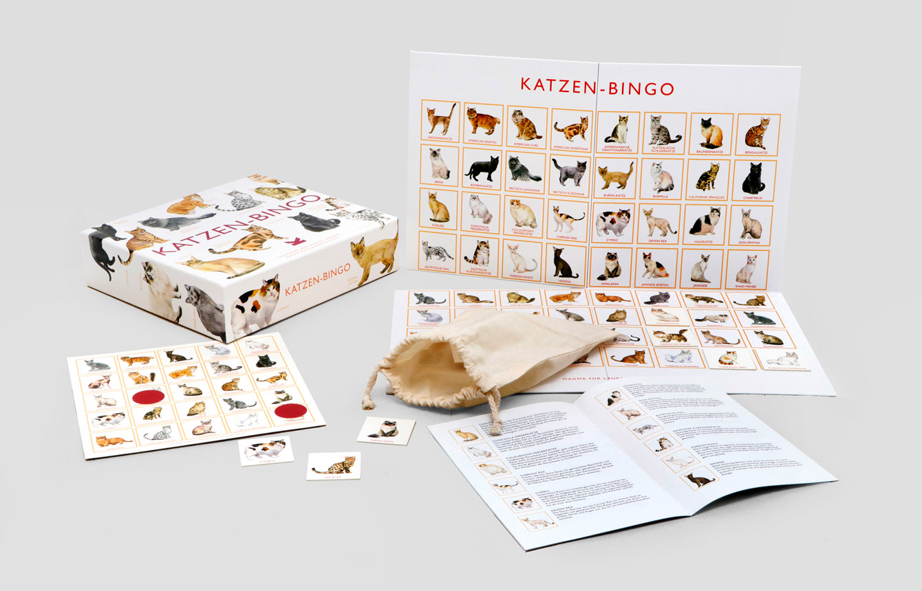| Zusatzinfo | Spielbrett, 12 Bingokarten, 64 Katzen-Kärtchen, 200 Chips und Leinensäckchen in Box |