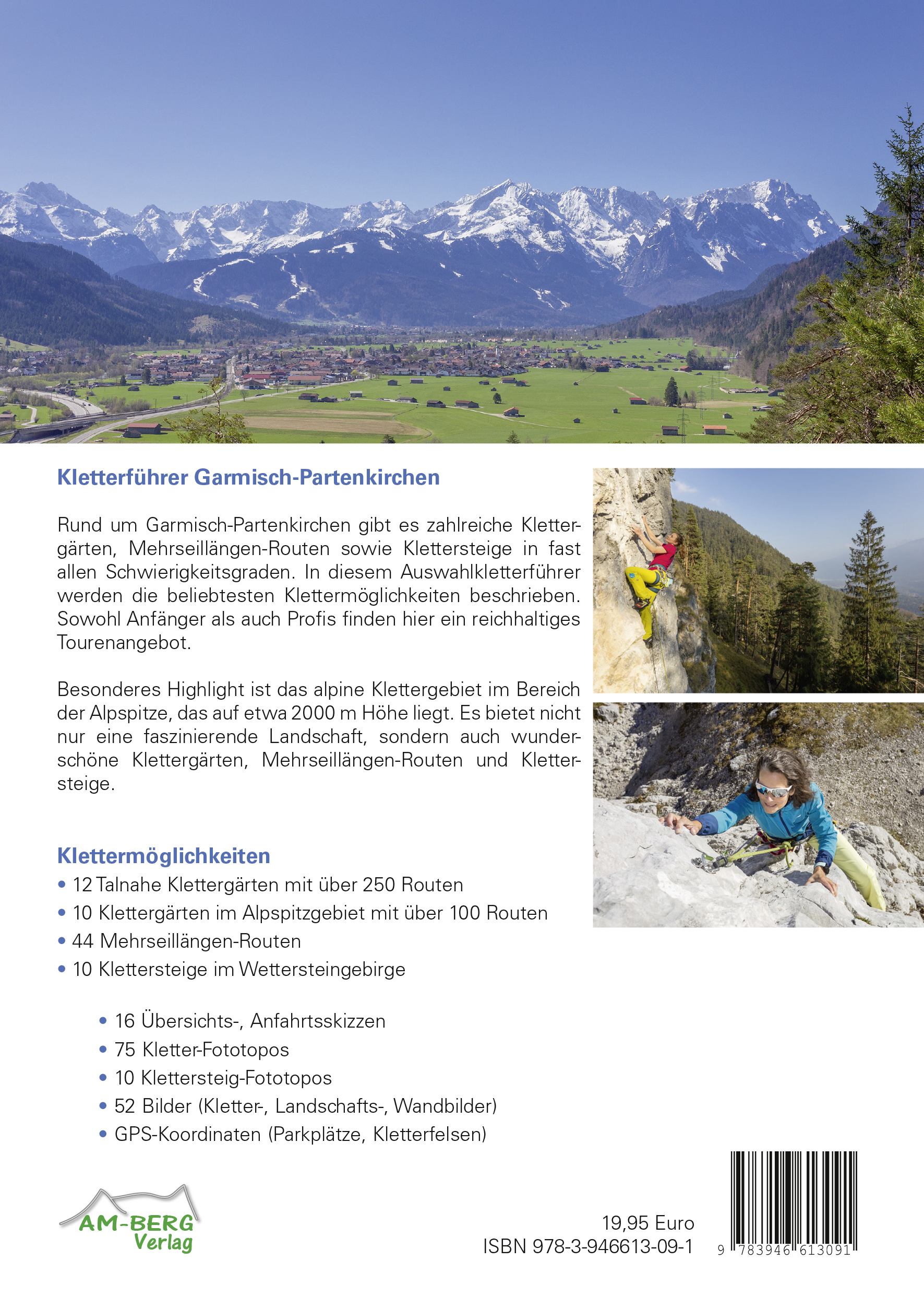 Kletterführer Garmisch-PartenkirchenRund um Garmisch-Partenkirchen gibt es zahlreiche Klettergärten, Mehrseillängen-Routen sowie Klettersteige in fast allen Schwierigkeitsgraden. In diesem Auswahlkletterführer werden die beliebtesten Klettermöglichkeiten beschrieben. Sowohl Anfänger als auch Profis finden hier ein reichhaltiges Tourenangebot.Besonderes Highlight ist das alpine Klettergebiet im Bereich der Alpspitze, das auf etwa 2000 m Höhe liegt. Es bietet nicht nur eine faszinierende Landschaft, sondern auch wunderschöne Klettergärten, Mehrseillängen-Routen und Klettersteige.Klettermöglichkeiten- 12 Talnahe Klettergärten mit über 250 Routen- 10 Klettergärten im Alpspitzgebiet mit über 100 Routen- 44 Mehrseillängen-Routen- 10 Klettersteige im Wettersteingebirge- 16 Übersichts-, Anfahrtsskizzen- 75 Kletter-Fototopos- 10 Klettersteig-Fototopos- 52 Bilder (Kletter-, Landschafts-, Wandbilder)- GPS-Koordinaten (Parkplätze, Kletterfelsen)