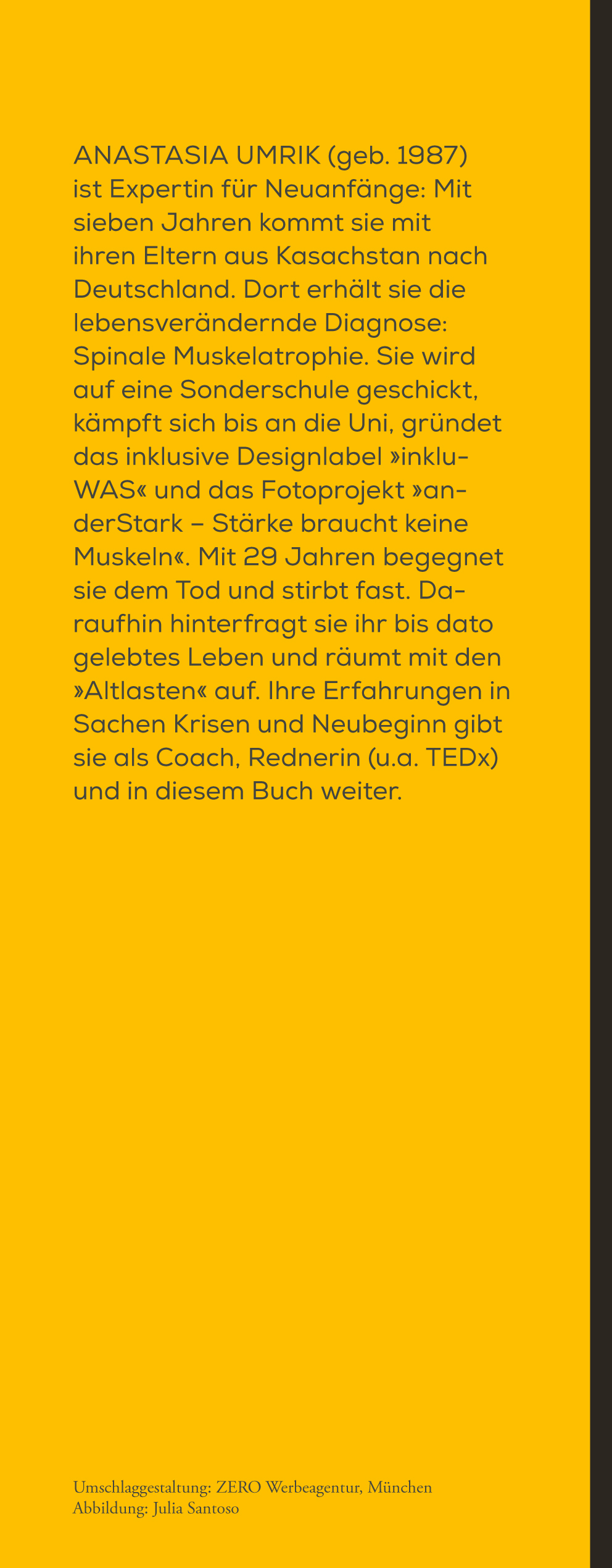 Anastasia Umrik (geb. 1987) ist „Expertin für Neuanfänge“ (taz): mit sieben Jahren kommt sie mit ihren Eltern aus Kasachstan nach Deutschland, dort erhält sie die niederschmetternde Diagnose: Muskelatrophie. Sie wird auf eine Sonderschule geschickt, kämpft sich bis an die Uni, gründet das inklusive Designlabel „inkluWAS“ und das Fotoprojekt „anderStark - Stärke braucht keine Muskeln“. Mit 29 Jahren hat sie eine Nahtoderfahrung. Daraufhin hinterfragt sie ihr bis dato gelebtes Leben und räumt mit den „Altlasten“ auf. Ihre Erfahrungen in Sachen Krisen und Neubeginn gibt sie als Coach, Rednerin (u.a. TEDx) und Autorin weiter.