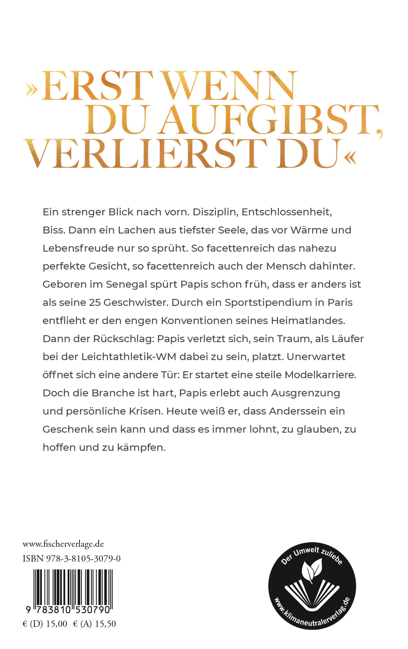 Ein strenger Blick nach vorn. Disziplin, Entschlossenheit, Biss. Dann ein Lachen aus tiefster Seele, das vor Wärme und Lebensfreude nur so sprüht. So facettenreich das nahezu perfekte Gesicht, so facettenreich auch der Mensch dahinter. Geboren im Senegal spürt Papis schon früh, dass er anders ist als seine 25 Geschwister. Durch ein Sportstipendium in Paris entflieht er den engen Konventionen seines Heimatlandes. Dann der Rückschlag: Papis verletzt sich, sein Traum, als Läufer bei der Leichtathletik-WM dabei zu sein, platzt. Unerwartet öffnet sich eine andere Tür: Er startet eine steile Modelkarriere. Doch die Branche ist hart, Papis erlebt auch Ausgrenzung und persönliche Krisen.