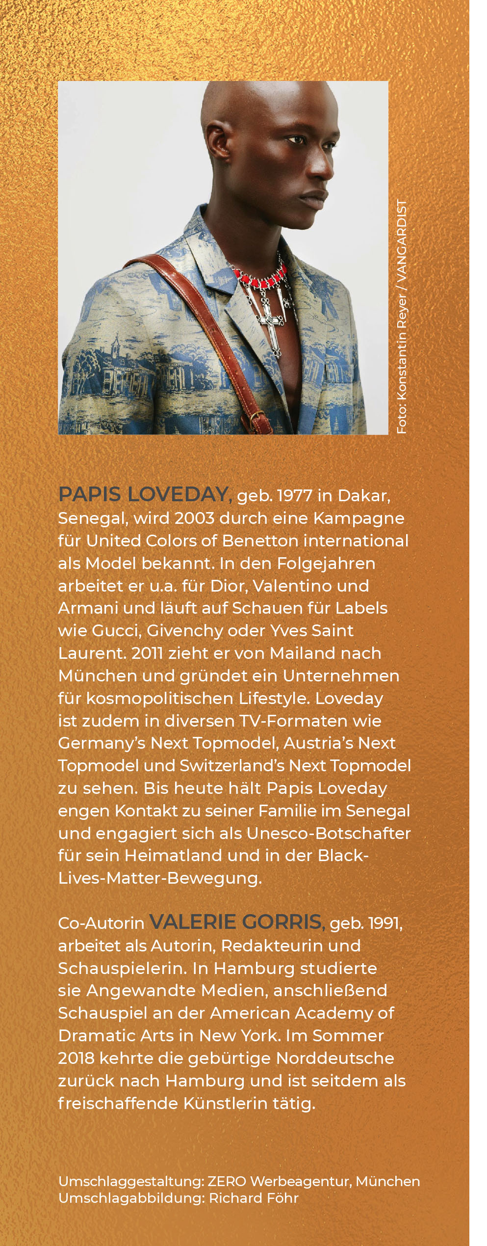 Papis Loveday (*1977 in Dakar) wird durch eine Kampagne für United Colors of Benetton als Model bekannt. Er arbeitet für Dior, Valentino und Armani. Auf internationalen Schauen läuft er für Labels wie Gucci, Givenchy oder Yves Saint Laurent. 2011 zieht er nach München und gründet ein Unternehmen. Papis ist zudem in diversen TV-Formaten wie Germany’s Next Topmodel, Austria’s Next Topmodel, Switzerland’s Next Topmodel und Promi Shopping Queen zu sehen. Bis heute hält Papis engen Kontakt zu seiner Familie im Senegal und engagiert sich als Unesco-Botschafter für sein Heimatland und in der Black-Lives-Matter-Bewegung.
