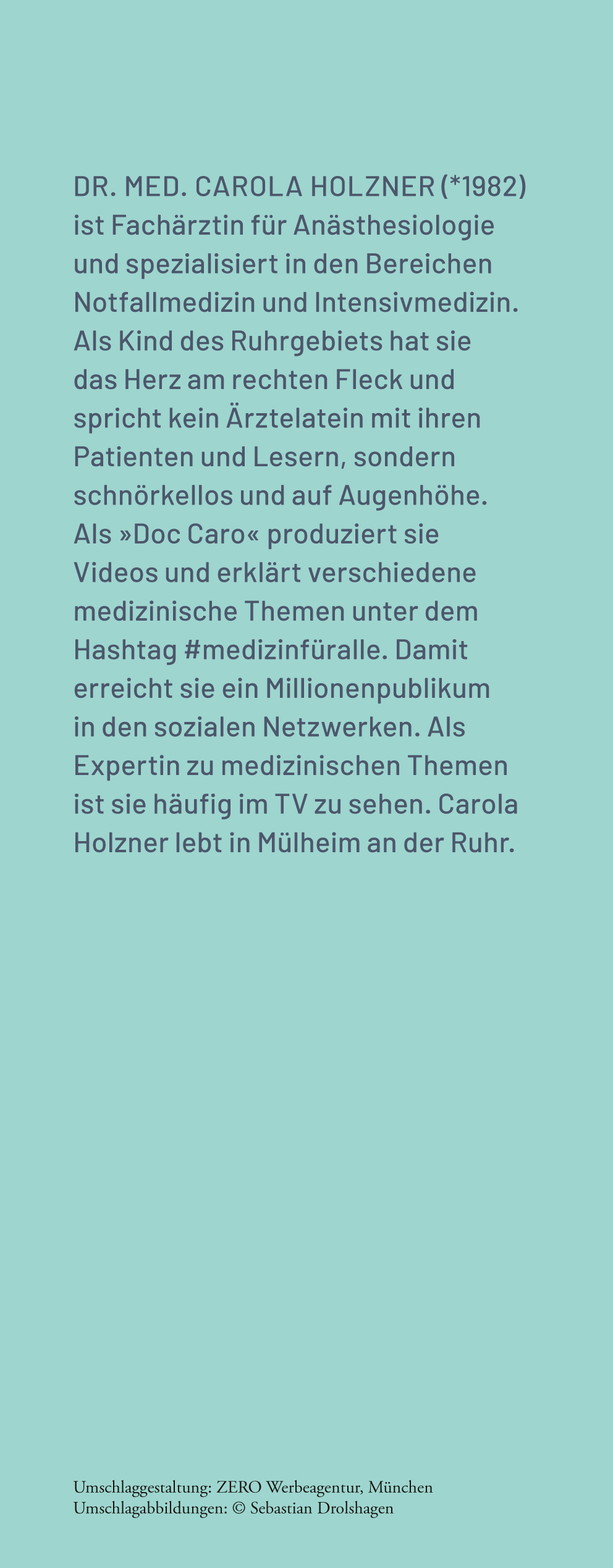 Dr. med. Carola Holzner (*1982) ist Fachärztin für Anästhesiologie und spezialisiert in den Bereichen Notfallmedizin und Intensivmedizin. Als Kind des Ruhrgebiets hat sie das Herz am rechten Fleck und spricht kein Ärztelatein mit ihren Patienten und Lesern, sondern schnörkellos und auf Augenhöhe. Als »Doc Caro« produziert sie Videos und erklärt verschiedene medizinische Themen unter dem Hashtag #medizinfüralle. Damit erreicht sie ein Millionenpublikum in den sozialen Netzwerken. Als Expertin zu medizinischen Themen ist sie häufig im TV zu sehen. Carola Holzner lebt in Mülheim an der Ruhr.