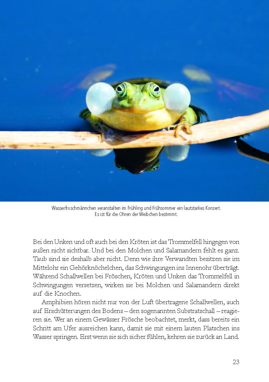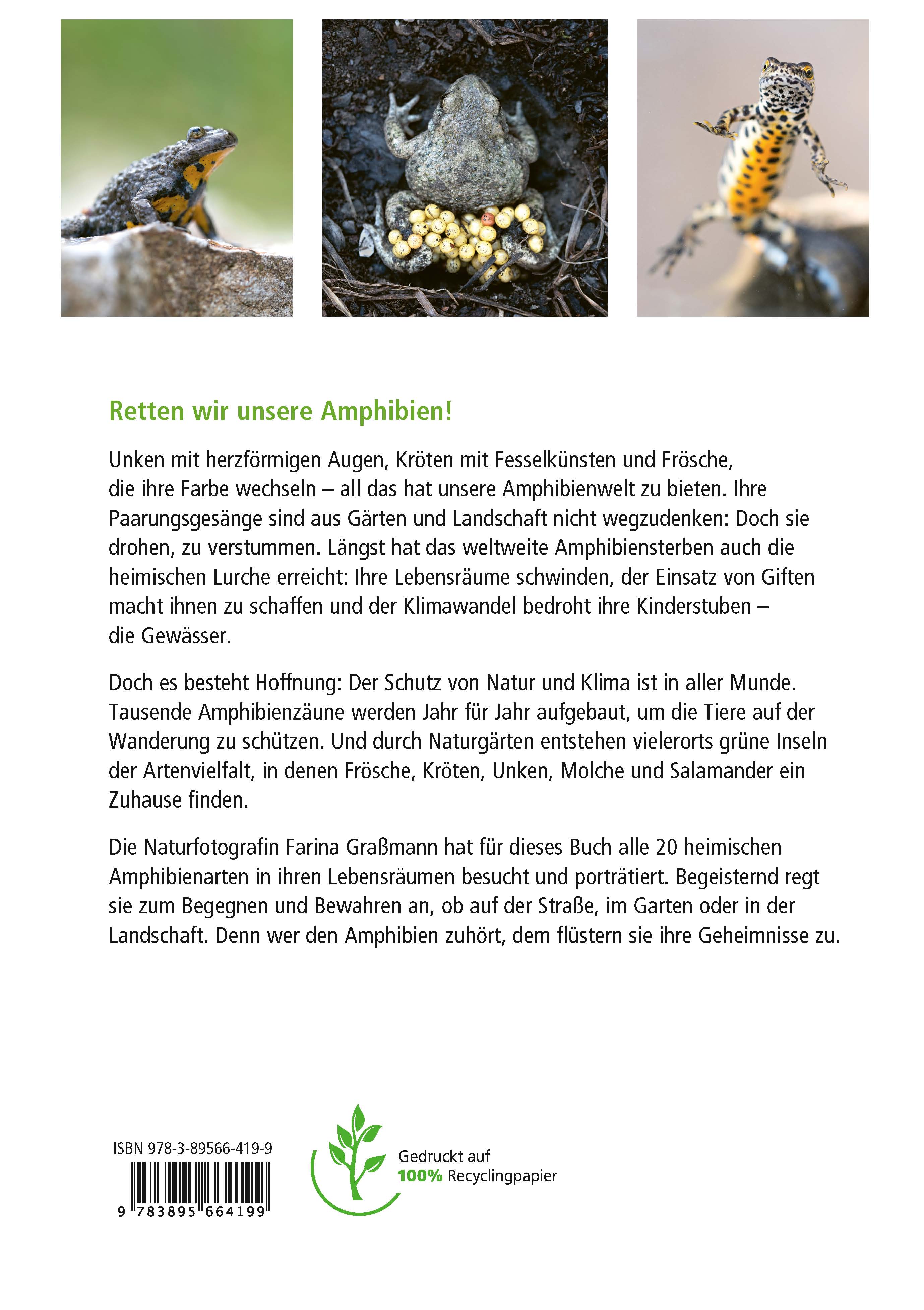 Farina Graßmann porträtiert in diesem Buch alle 20 in Deutschland natürlicherweise heimischen Amphibienarten und gibt Anregungen für ihren Schutz, ob auf der Straße, im Garten oder in der Landschaft. Begeisternd regt sie zum Begegnen und Bewahren an. Denn wer den Amphibien zuhört, dem flüstern sie ihre Geheimnisse zu.
