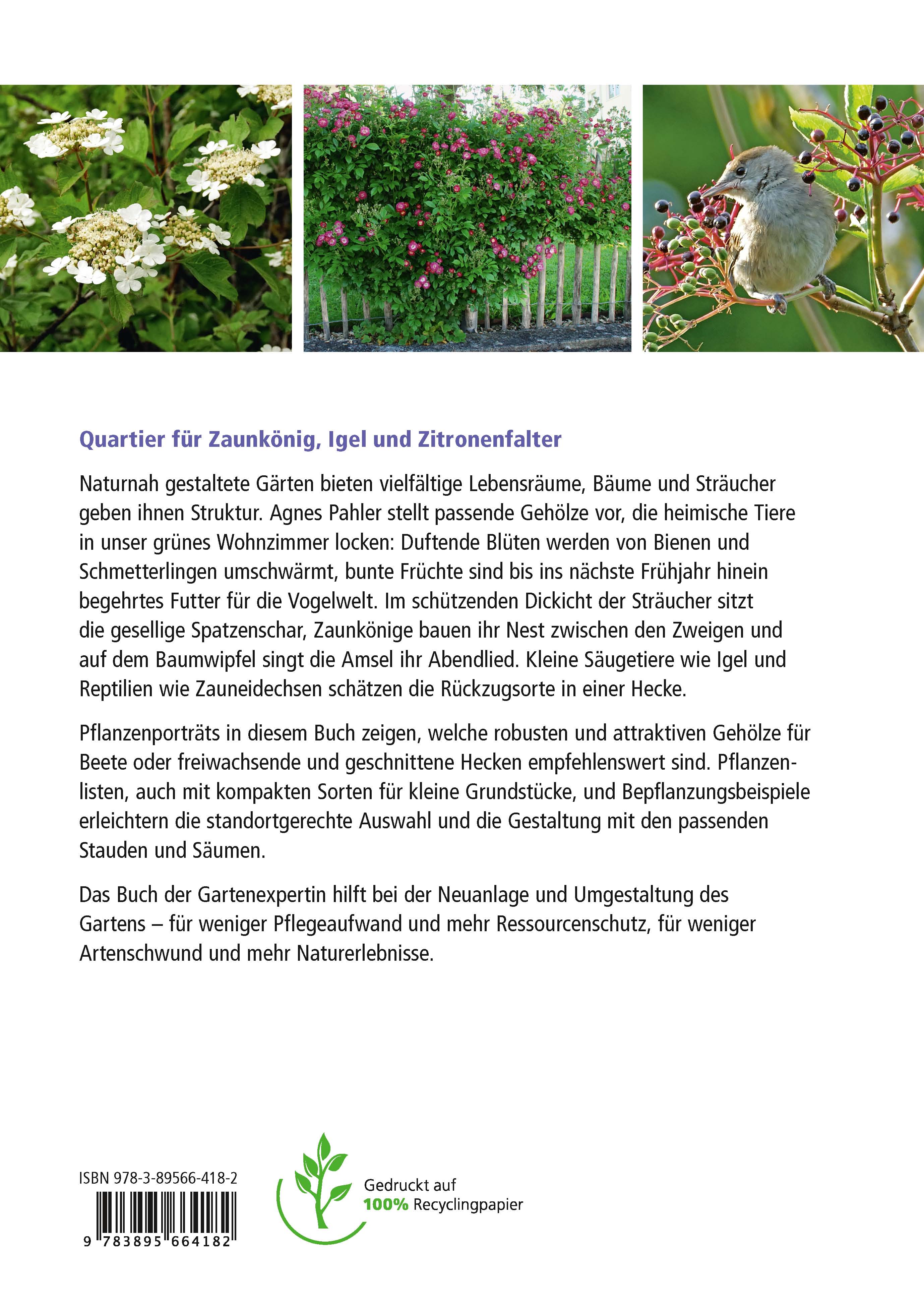Die Gartenexpertin Agnes Pahler stellt eine bunte Palette an passenden Gehölzarten für jeden Standort vor und erklärt, wie einfach wir der heimischen Tierwelt durch die richtige Bepflanzung helfen können. Pflanzenporträts zeigen, welche robusten und attraktiven Sträucher und Bäume für den naturnahen Garten besonders zu empfehlen sind und was sie Bienen, Faltern, Vögeln oder Kleinsäugern bieten. Pflanzbeispiele erleichtern die standortgerechte Auswahl und die Gestaltung mit den passenden Stauden und Säumen. Praxisnahe Tipps helfen bei der Neuanlage und der Umgestaltung des Gartens - für weniger Pflege- und Ressourcenbedarf, für mehr Artenvielfalt.