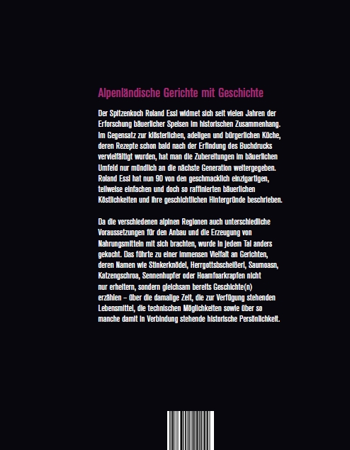 Alpenländische Gerichte mit GeschichteWer Roland Essl kennt, weiß, dass der Spitzenkoch ein besonderes Faible für die besonderen Rezepte der alpinen Küche hat. Essl widmet sich seit vielen Jahren der Erforschung der bäuerlichen Speisen im historischen Zusammenhang. Solche Rezepte sind nicht einfach zu finden. Im Gegensatz zur klösterlichen, adeligen und bürgerlichen Küche, deren Rezepte schon bald nach der Erfindung des Buchdrucks vervielfältigt wurden, hat man die Rezepte im bäuerlichen Umfeld noch lange meist nur mündlich an die nächste Generation weitergegeben.Und in jedem Tal wurde anders gekocht, weil die verschiedenen alpinen Regionen auch unterschiedliche Voraussetzungen für den Anbau und die Erzeugung von Nahrungsmitteln mit sich brachten. Das führte aber umgekehrt zu einer immensen Vielfalt an Gerichten, deren Namen wie etwa Stinkerknödel, Herrgottsbscheisserl, Saumoasn, Katzengschroa, Sennenhupfer oder Hoamfoarkrapfen nicht nur erheitern, sondern gleichsam bereits Geschichte(n) erzählen - über die damalige Zeit, die zur Verfügung stehenden Lebensmittel und technischen Möglichkeiten sowie über so manche damit in Verbindung stehende historische Persönlichkeit wie Anna von Österreich, Josef Wenzel Radetzky, Giuseppe Cipriani, Georg Lahner, Ignatz Mautner von Markhof, Martin Luther oder auch Karl den Großen.