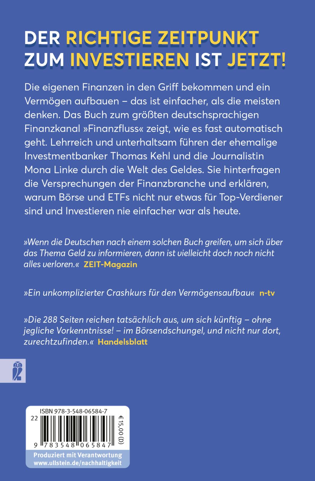 Ab sofort gibt es keine Ausreden mehr, den Vermögensaufbau zu vertagen. Nie war es so einfach wie heute, sein Geld trotz Nullzinsen gewinnbringend anzulegen. Das Buch von den Macher*innen des erfolgreichen YouTube-Kanals »Finanzfluss« holt die Leser*innen ab und gibt Impulse, Verantwortung für die eigene finanzielle Situation zu übernehmen und Begeisterung für die persönliche Vermögensbildung zu entfachen. Der ehemalige Investmentbanker Thomas Kehl und die Journalistin Mona Linke erklären, wie man mithilfe von Aktien und ETFs passiv ein Vermögen aufbauen kann, ohne dabei viel Risiko einzugehen, und wie das genau funktioniert.¶ Ein Empowerment-Programm und Schnellkurs in Sachen Vermögensaufbau für alle – verständlich, motivierend und vor allem wirksam!