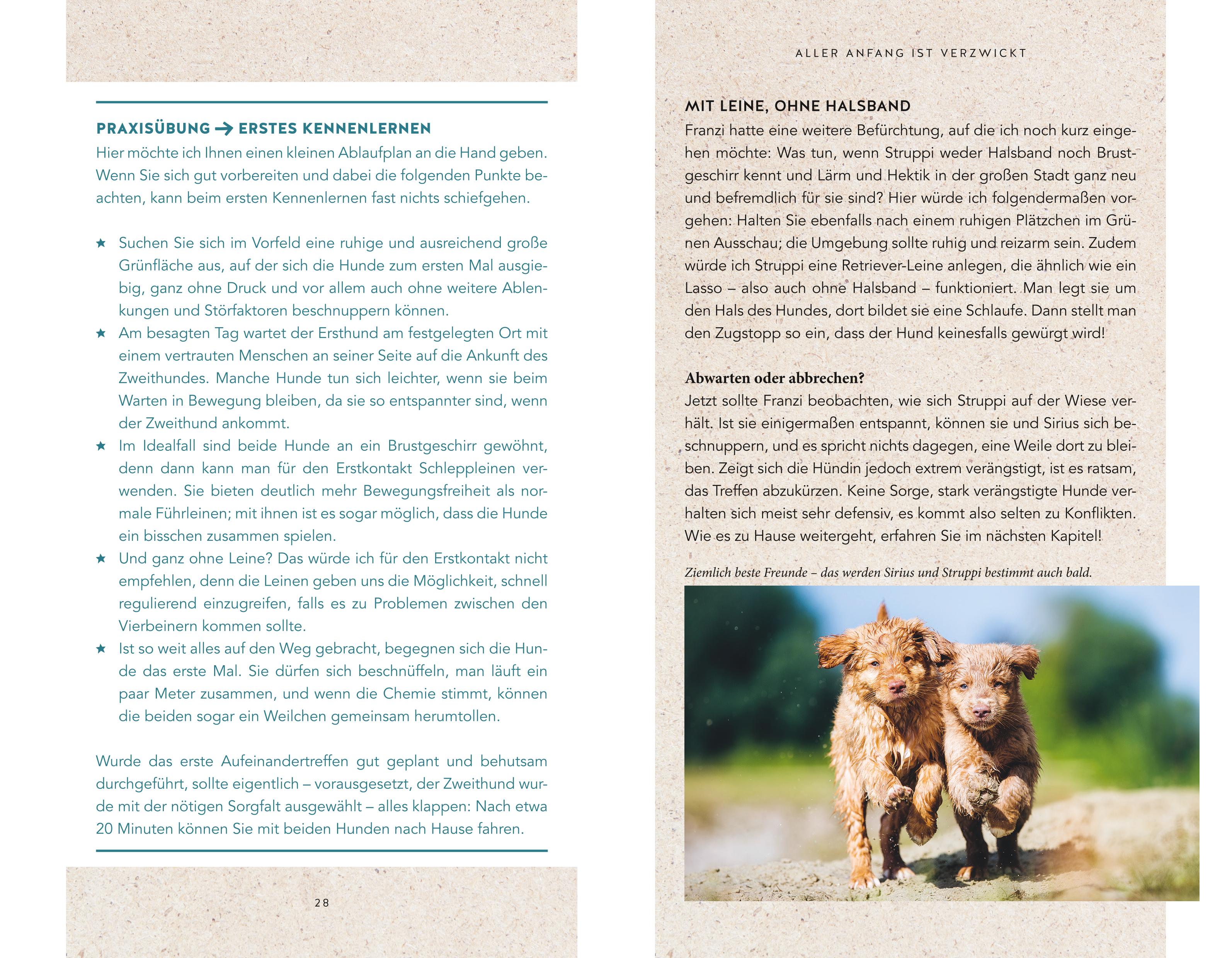 Franzi, die Protagonistin, träumt von einem Zweithund, und so zieht die kleine Struppi ein. Wie die Familie mit zwei Hunden zurechtkommt, wie Ersthund Sirius reagiert, welche Probleme in der Mehrhundehaltung auftauchen können und ob das Leben mit zwei Fellnasen in der Summe ein großes Glück oder doch eher eine große Herausforderung darstellt (oder beides) - das ist das Thema des neuen Buches von Autorenteam Julie Leuze und André Henkelmann nach ihrem Titel "Die Kunst, einen Welpen zu bändigen". Das Element Stammtisch für Mehrhundehalter ermöglicht es den Autoren, die verschiedensten Hund-Hund-Konstellationen mit ihren spezifischen Problemen darzustellen, ohne auf den roten Faden im erzählerischen Buchteil verzichten zu müssen.