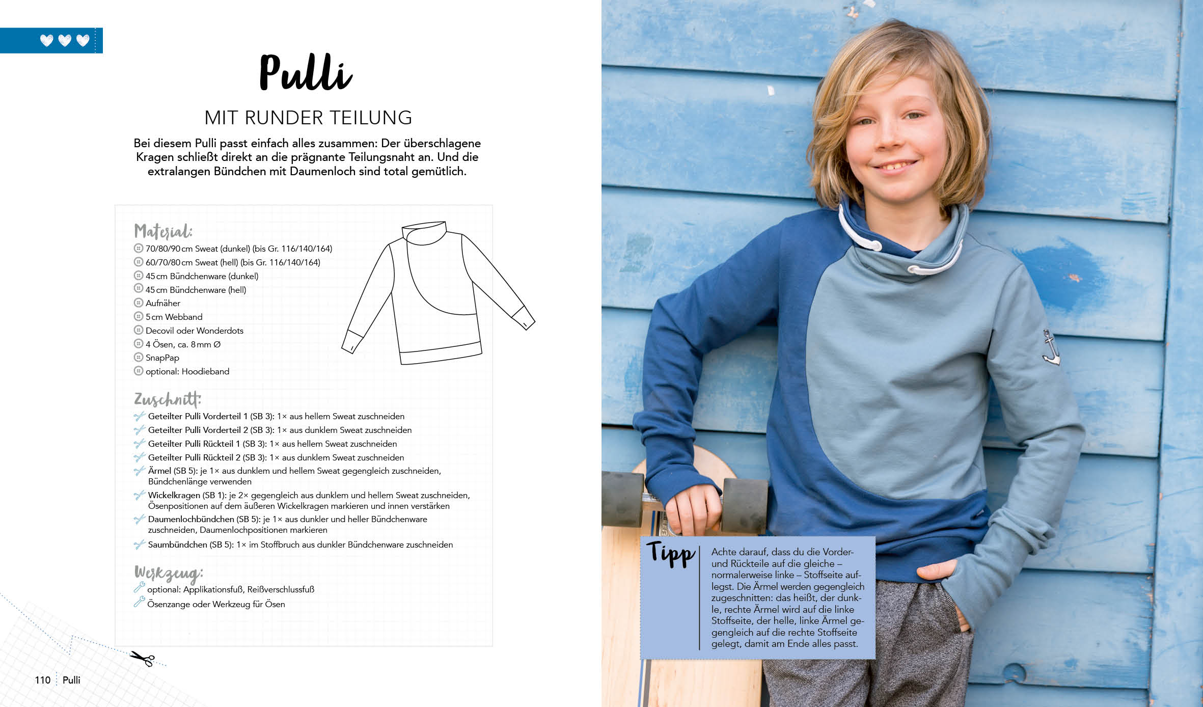 Ob Kängurutasche, unterschiedliche Ärmel- und Pullilängen, diverse Ausschnitt- und Kragenvarianten und trendige Applikationen wie Patches und Wendepailletten– hier wird jedes Stück zum Unikat. Selbst gestaltet und genäht – so macht Kindermode Spaß!
