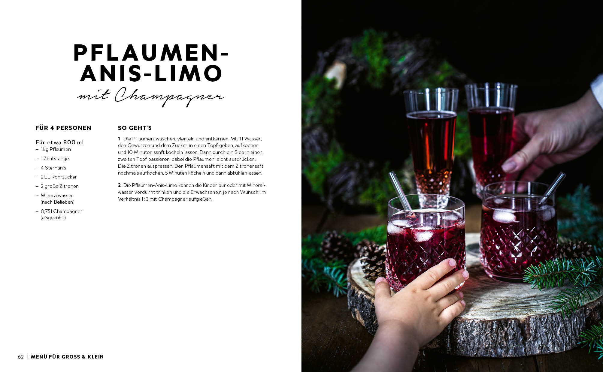 Egal ob Thunfischtatar mit Wasabicreme, Geschmortes Rind mit Orangen-Gremolta, Mezzalune mit asiatischer Kürbisfüllung oder Tonkabohnen-Pannacotta, das passende Getränk gibt es zu jedem Menü dazu - dies kann z.B. mal ein Birne-Salbei-Drink mit Champagner sein. Tipps zu Kombinationsmöglichkeiten der unterschiedlichen Gänge, falls mal ein Veganer unter den Fleischliebhabern dabei ist, runden das Buch ab.