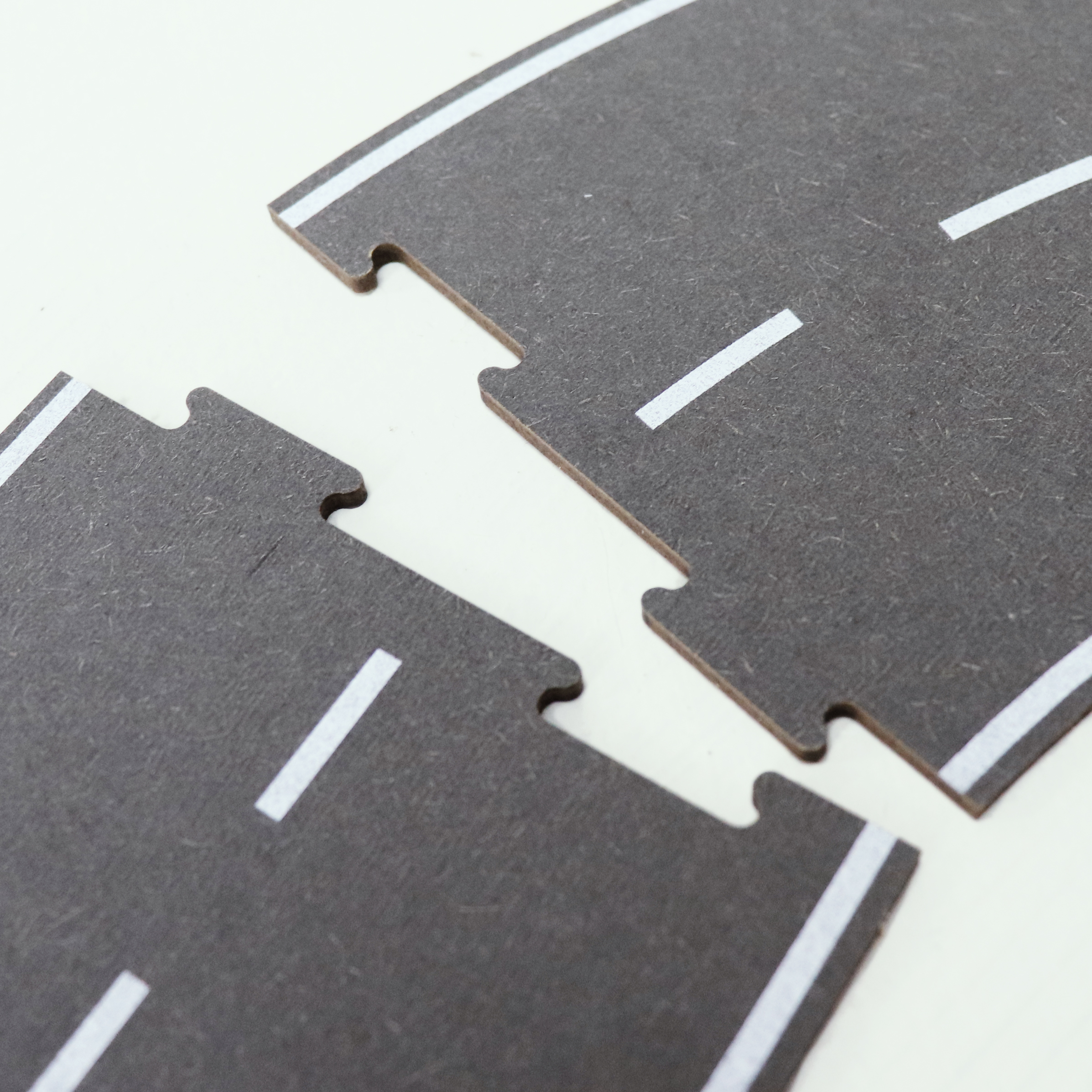 Das verwendete Material ist Holzwerkstoff aus recyceltem Holz aus verantwortungsvollen Quellen und eine nachhaltige Alternative zu Plastik. Bei Naturprodukten aus Holz kann es zu Abnutzungserscheinungen und beim Druck zu kleinen Farbabweichungen kommen. Das Starter Set ist für eine bis zu 7 Meter lange Straße konzipiert. Für alle, die auf der Suche nach einem Rundkurs sind, empfehlen wir den "MyRoads" Racing Track.