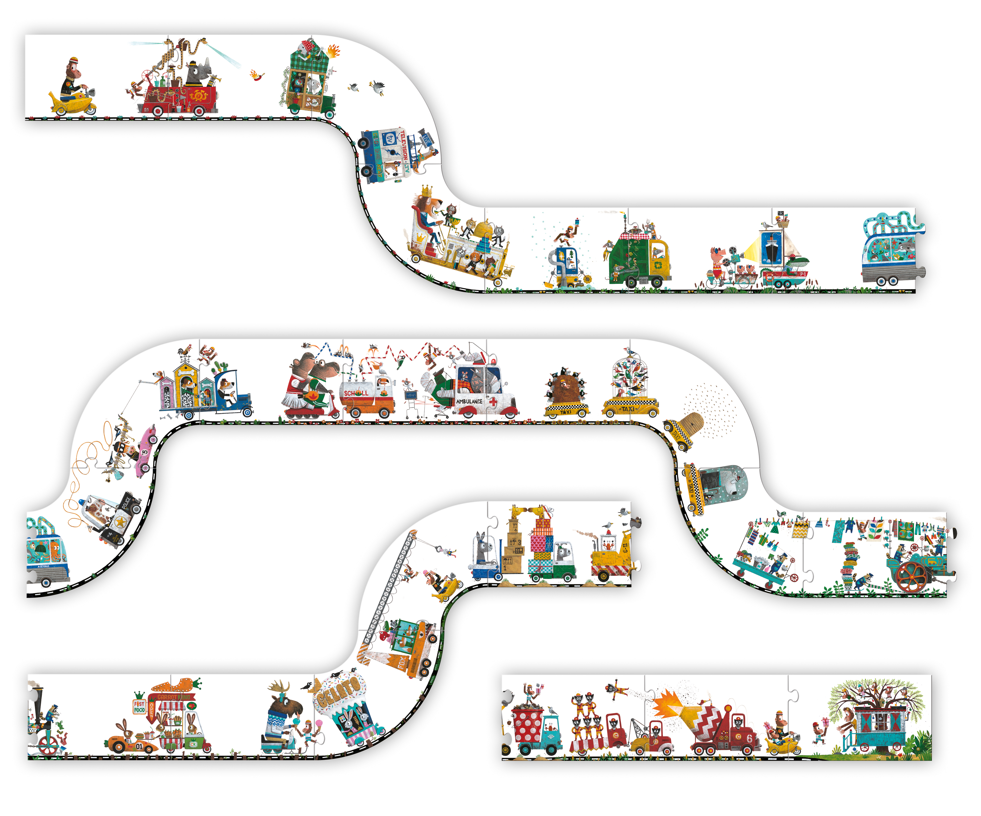 Ob ein Bus voller Fische oder ein Bienenstock auf Rädern - dieser Stau ist alles andere als langweilig! Die fantasievollen Fahrzeuge von Leo Timmers bringen die ganze Familie zum Lachen und Staunen und lassen sich zu einer meterlangen, kurvigen Strecke puzzeln. Das Zusammenfügen der handlichen Teile fördert spielend leicht Konzentration und Vorstellungsvermögen und bringt den wohl verrücktesten Stau aller Zeiten direkt ins Kinderzimmer!