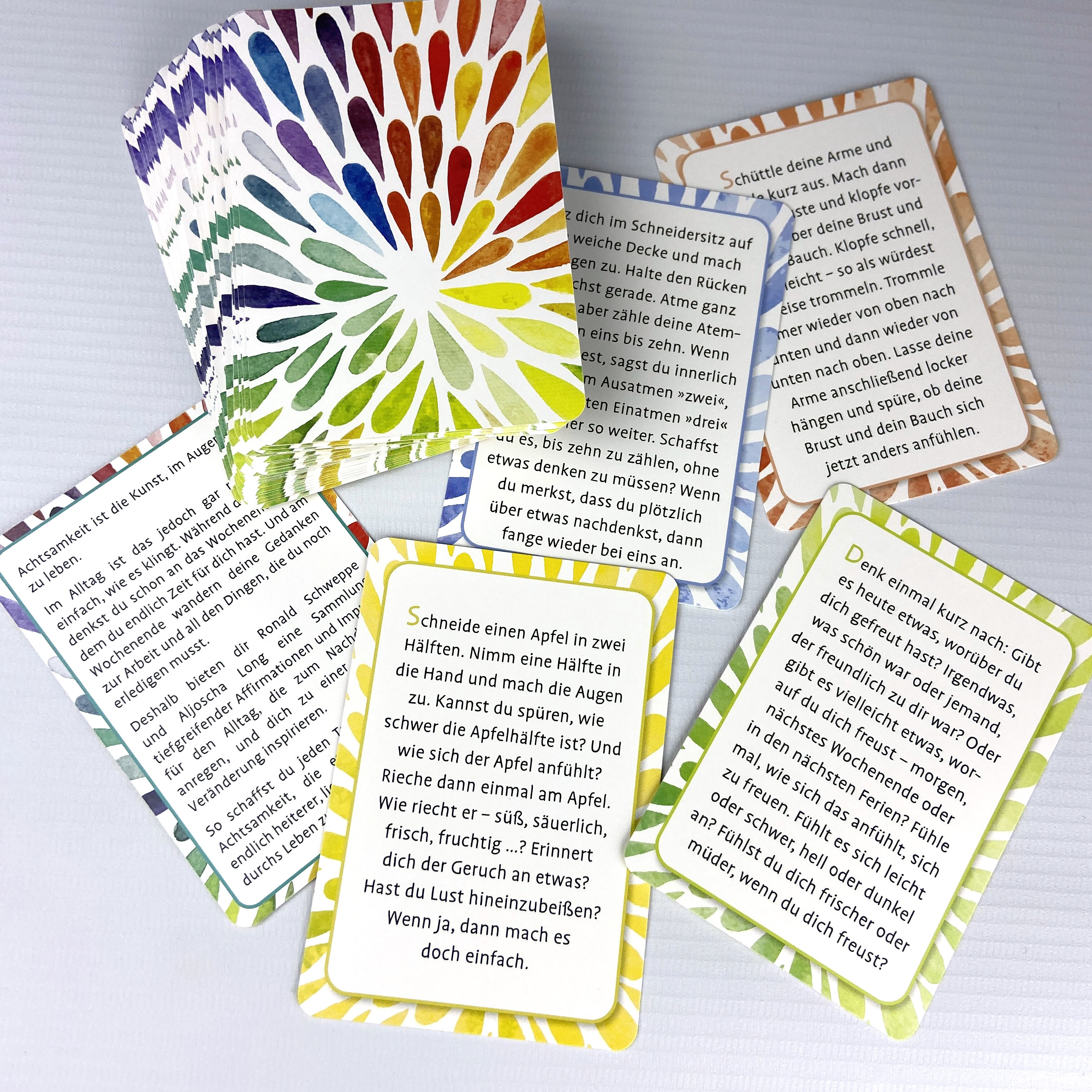 In einer Welt der Reizüberflutung fällt es Kindern zunehmend schwerer, sich selbst und ihre Umwelt achtsam und mit allen Sinnen wahrzunehmen. Dabei ist es gerade in der Kindheit entscheidend, möglichst viele Erfahrungen mit der eigenen Lebendigkeit zu sammeln und entspannt im Jetzt zu leben. Das Kartendeck bietet leicht verständliche und kreative Impulse für Kinder ab 5 Jahren an. Diese können Sie praktisch in die Alltagsroutine Ihrer Kinder einbinden und ihnen so ermöglichen, die kleinen und großen Wunder des Lebens mit allen Sinnen zu entdecken.