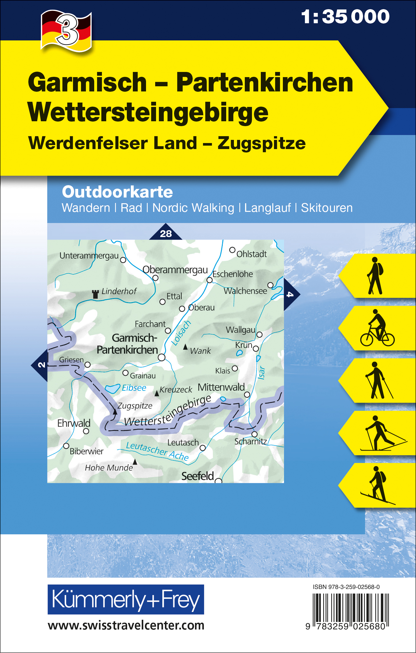 In der Kümmerly+Frey Outdoorkarte Garmisch-Partenkirchen, Wettersteingebirge im Massstab 1:35'000 finden Sie die besten Routen für ganz unterschiedliche Sportarten.
