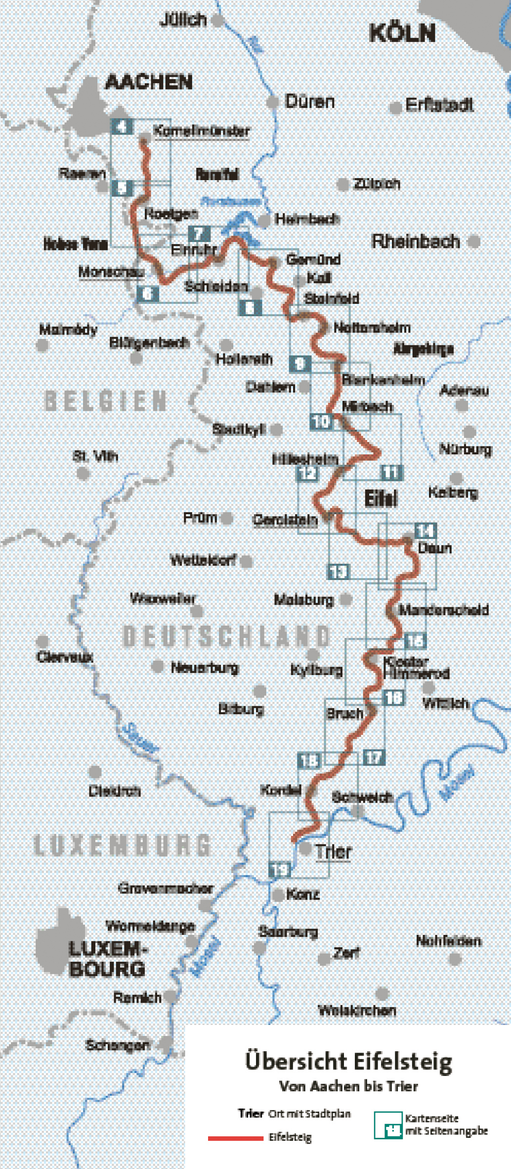 - Der 313 km lange Eifelsteig zwischen Aachen und Trier führt als "Premiumwanderweg" quer durch die Eifel.