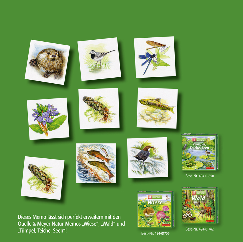 Memos sind überholt und aus Großmutters Zeiten? - Wohl kaum! Das neue Quelle & Meyer Natur-Memo "Quellen, Bäche, Flüsse" versprüht farbenfrohe Nostalgie und verspricht Spielspaß für die ganze Familie. 64 Spielkarten - wunderschön illustriert von Roland Spohn - ermöglichen ein spielerisches Kennenlernen dieses einzigartigen Naturraums. Das neue Natur-Memo lässt sich perfekt erweitern mit den beliebten Quelle & Meyer Natur-Memos "Wiese" (GTIN 426-009855-028-3), "Wald" (GTIN 426-009855-030-6) und "Tümpel, Teiche, Seen" (GTIN 426-009855-034-4).