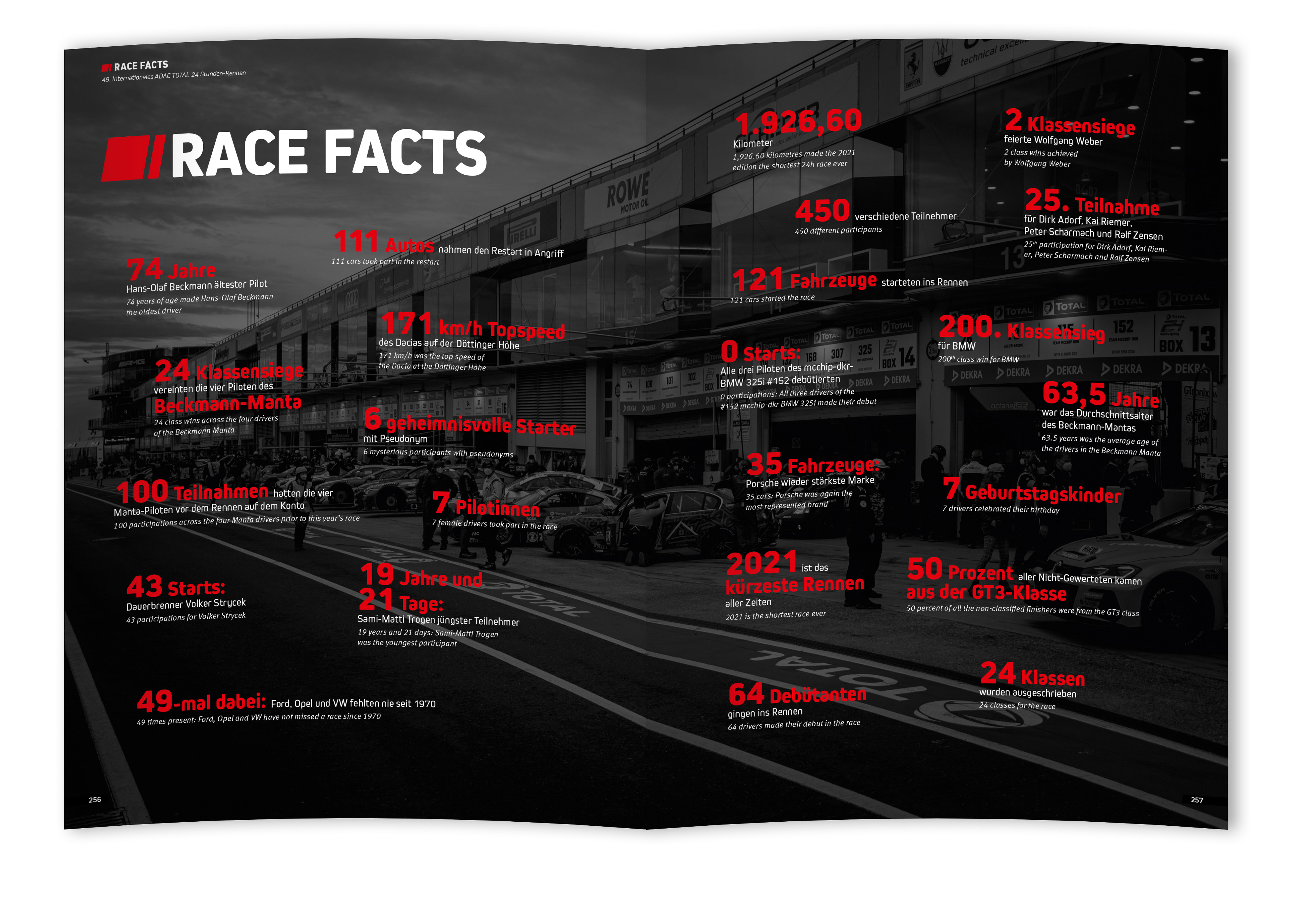 Herzschlagfinale beim 49. ADAC TOTAL 24h-Rennen auf der Nordschleife: Der siegreiche Manthey-Porsche hatte am Ende gerade einmal 8,817 Sekunden Vorsprung vor dem zweitplatzierten ROWE-BMW. Die Plätze drei bis sieben waren lediglich durch 5,6 Sekunden getrennt.Eine lange Unterbrechung wegen Nebels führte dazu, dass nach dem Restart nur noch dreieinhalb Stunden Fahrzeit auf der Uhr standen. Die Folge: Das 24-Stunden-Rennen wurde durch ein Sprintrennen entschieden. Tatsächlich stellte das Rennen mit einer Fahrzeit von knapp zehn Stunden einen neuen Minusrekord auf. Schuld daran waren einmal mehr die Wetterverhältnisse auf dem Nürburgring, die ein längeres Fahren nicht möglich machten. Am Ende ging es in vielen der 24 verschiedenen Klassen eng zu: Ob Porsche Cayman-Cup, Produktionswagen bis 2.000 ccm mit Turbo, Specials bis 2.600 ccm mit Turbo und bis 4.000 ccm mit Turbo, GT4 oder TCR: Hier fielen die Entscheidungen um den Sieg sehr knapp aus.Das Rahmenprogramm war erneut hochkarätig: Zum 30. Mal starteten die Young- und Oldtimer im 3h-Classic-Rennen, der Tourenwagen-Weltcup war zum siebten Mal dabei und die Rundstrecken-Challenge Nürburgring, Deutschlands älteste und größte Breitensportserie, eröffnete wie gewohnt das Renngeschehen am Donnerstagmorgen. Abgerundet wurde das Geschehen von einer Premiere: dem ersten Auftritt der Tourenwagen-Legenden aus der ehemaligen DTM.Das 24h-Jahrbuch beleuchtet auch in diesem Jahr ausführlich das Geschehen in allen 24h-Klassen sowie die Rennen des Rahmenprogramms und die Trainingssitzungen. Hunderte Fotos runden - ergänzt durch viele Tabellen und Statistiken - das Buch ab.