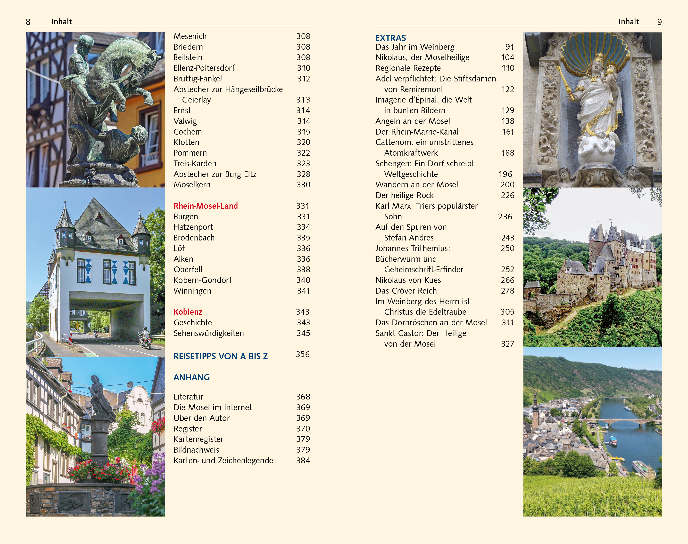 Vorwort 11Besondere Sehenswürdigkeiten 12Das Wichtigste in Kürze 14STADT-LAND-FLUSS 16Steckbrief Mosel 18Geografie 19Die Mosel auf der Landkarte 20Moselstaaten 20Der Lauf des Flusses 22Die Länge der Mosel 23Der Name der Mosel 24Woher kommt das Moselwasser? 25Wassertiefe und Pegelstände 25Natur und Naturschutz 27Naturparks und Schutzgebiete 27Fischschutz 30Flora und Fauna 30Tierwelt 31Pflanzenwelt 35Geschichte 38Die Urmosel 38Die ersten Siedler 39Die Römer kommen 40Römischer Neuanfang 42Erste Bischofsstädte 43Die Franken 44Karolinger als Reformer 45Mächtige Erzbischöfe 47Hexenverfolgung 48Franzosenzeit 49Neue Spannungen 49Erster Weltkrieg 50Zwischen den Kriegen 51Zweiter Weltkrieg 52Neuaufbau nach 1945 53Neue Völkerfreundschaft 54Europa wird grenzenlos 55Wirtschaft 56Von Furten und Brücken 56Moselfähren 57Flößerei auf der Mosel 58Moselschifffahrt 59Weinland Mosel 70Vier Weinbaugebiete 72Rebsorten 75Weinbaugeschichte 79Wein probieren 88Wein kaufen 90Straußwirtschaften 90Kunst, Kultur, Brauchtum 92Die Sprachen an der Mosel 94Kunst und Architektur 95Die Mosel als Filmkulisse 99Feste und Bräuche 99Essen und Trinken 106DIE OBERMOSEL 112Von Bussang bis Messein 115Moselquelle 115Bussang 116Zwischen Bussang und Remiremont 118Remiremont 119Zwischen Remiremont und Épinal 124Épinal 125Zwischen Épinal und Charmes 131Charmes 133Die Wilde Mosel 135Abstecher nach Nancy 140Geschichte 140Altstadt 141Neustadt 147Jugendstilviertel Saurupt 148Jardin Botanique Jean-Marie Pelt 149FRANKREICHS SCHIFFBARE MOSEL 152Zwischen Nancy und Toul 155Toul 156Zwischen Toul und Pompey 162Zwischen Pompey und Pont-à- Mousson 164Großregion Metz 167Metz 171Geschichte 171Orientierung 172Sehenswürdigkeiten 175Von Metz zum Dreiländereck 181DREI-LÄNDER-MOSEL 190Von Schengen nach Konz 192Schengen 192Perl 197Palzem 202Remich 202Luxemburgische Weinstraße 203Wormeldange 204Nittel 204Grevenmacher 205Wasserbillig und Mertert 206Abstecher nach Echternach 206Trierer Land 211Konz 214Abstecher an die Saar 216Trier 220Geschichte 221Sehenswürdigkeiten 223DIE DEUTSCHE MITTELMOSEL 238Von Schweich nach Bernkastel-Kues 240Schweich 240Longuich 245Riol 245Mehring 246Detzem 247Thörnich 247Klüsserath 247Leiwen 248Trittenheim 251Rund um Bernkastel-Kues 254Neumagen-Dhron 254Piesport 256Brauneberg 258Mühlheim an der Mosel 259Abstecher nach Veldenz 260Lieser 260Bernkastel-Kues 262Stadtgeschichte 262Sehenswürdigkeiten in Bernkastel 264Sehenswürdigkeiten in Kues 268Graach 271Zeltingen-Rachtig 272Ürzig 273Erden 274Lösnich 275Rund um Traben-Trarbach 275Traben-Trarbach 279Geschichte 279Sehenswürdigkeiten 280Starkenburg 284Enkirch 284Reil 286DIE UNTERMOSEL 288Ferienregion Zeller Land 291Pünderich 291Briedel 291Zell an der Mosel 293Bullay 295Alf 296St. Aldegund 297Neef 298Ferienland Cochem 300Bremm 300Calmont Klettersteig 301Ediger-Eller 302Senheim-Senhals 307Mesenich 308Briedern 308Beilstein 308Ellenz-Poltersdorf 310Bruttig-Fankel 312Abstecher zur Hängeseilbrücke Geierlay 313Ernst 314Valwig 314Cochem 315Klotten 320Pommern 322Treis-Karden 323Abstecher zur Burg Eltz 328Moselkern 330Rhein-Mosel-Land 331Burgen 331Hatzenport 334Brodenbach 335Löf 336Alken