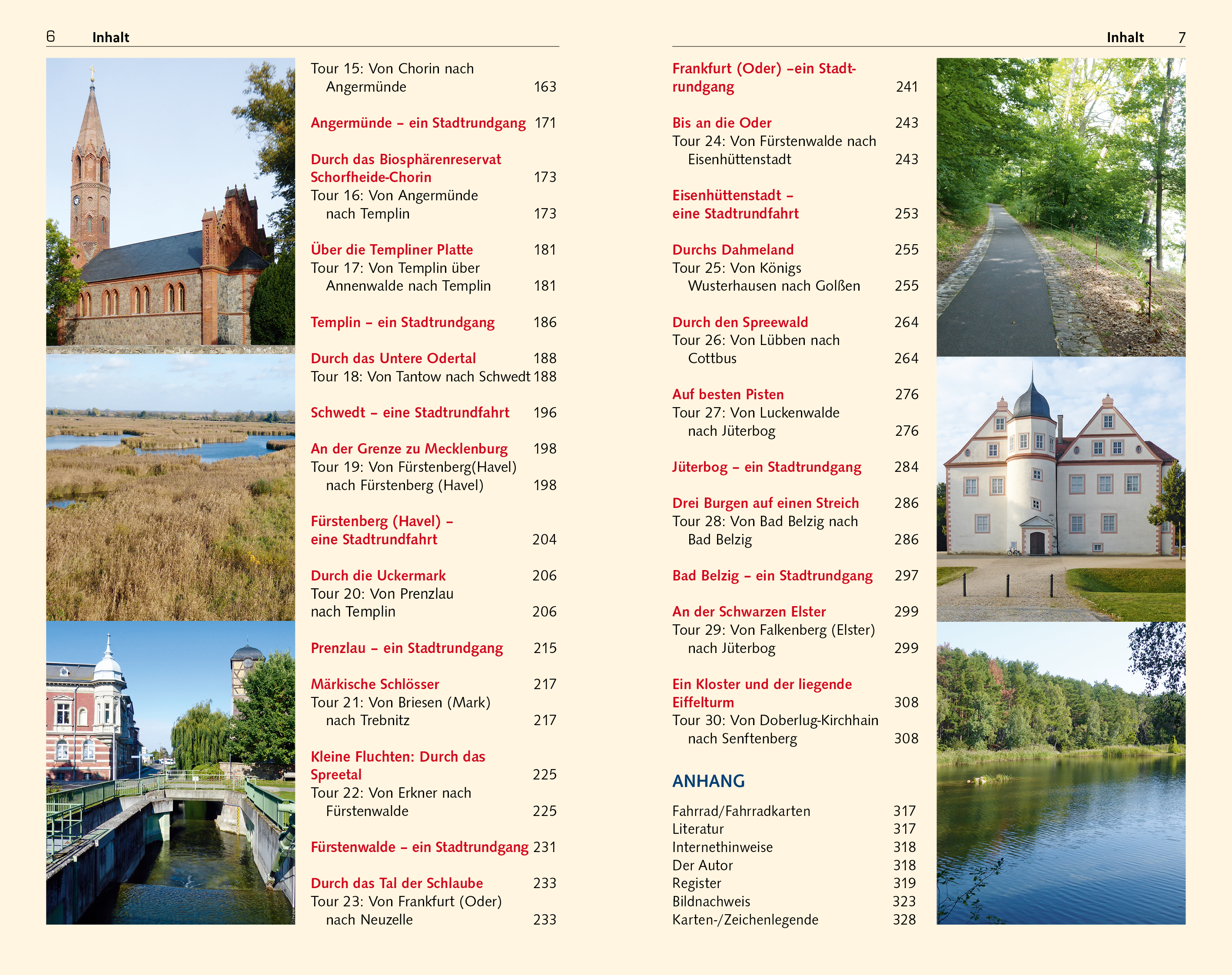 Vorwort 9RADFAHREN IN BRANDENBURG 11Zur Konzeption dieses Buches 12Vor der Tour 15Radfahrland Brandenburg 19Naturraum 20Landschaften 23Brandenburgische Geschichte 26TOUREN 33Wo alles begann ... 34Tour 1: Von Potsdam nach Brandenburg (Havel) 34Brandenburg an der Havel - ein Stadtrundgang 42Die Landschaft der Havelländischen Maler 44Tour 2: Von Potsdam nach Potsdam 44Potsdam - ein Stadtrundgang 51Kleine Fluchten 53Tour 3: An der Havel nach Potsdam 53An der Unteren Havel 61Tour 4: Von Rathenow nach Havelberg 61Havelberg - ein Stadtrundgang 69Durch das Havelland 71Tour 5: Von Rathenow nach Nauen 71Rathenow - ein Stadtrundgang 77An der Havel in den Norden 79Tour 6: Von Oranienburg nach Fürstenberg (Havel) 79Fontaneland 88Tour 7: Von Rheinsberg nach Paulinenaue 88Neuruppin - ein Stadtrundgang 97Durch das Löwenberger Land 99Tour 8: Von Gransee nach Oranienburg 99Gransee - ein Stadtrundgang 107Pilgerzeiten und eine Wasserburg 109Tour 9: Von Glöwen nach Glöwen 109Entlang der Stepenitz 116Tour 10: Von Wittenberge nach Pritzwalk 116Wittenberge - eine Stadtrundfahrt 124Wald, Wandlitz und eine Gewerkschaftsschule 126Tour 11: Von Oranienburg nach Bernau 126Oranienburg - eine Stadtrundfahrt 133Eisvogelland 135Tour 12: Durch das Biesenthaler Becken 135Bernau - ein Stadtrundgang 143An der märkischen Wupper 144Tour 13: Der Finowkanal von Niederfinow bis Ruhlsdorf-Zerpenschleuse 144Eberswalde - ein Stadtrundgang 152Der Oder entgegen 154Tour 14: Von Strausberg nach Bad Freienwalde 154Bad Freienwalde - eine Stadtrundfahrt 161Ein Kloster und das Dorf der sieben Seen 163Tour 15: Von Chorin nach Angermünde 163Angermünde - ein Stadtrundgang 171Durch das Biosphärenreservat Schorfheide-Chorin 173Tour 16: Von Angermünde nach Templin 173Über die Templiner Platte 181Tour 17: Von Templin über Annenwalde nach Templin 181Templin - ein Stadtrundgang 186Durch das Untere Odertal 188Tour 18: Von Tantow nach Schwedt 188Schwedt - eine Stadtrundfahrt 196An der Grenze zu Mecklenburg 198Tour 19: Von Fürstenberg(Havel) nach Fürstenberg (Havel) 198Fürstenberg (Havel) - eine Stadtrundfahrt 204Durch die Uckermark 206Tour 20: Von Prenzlau nach Templin 206Prenzlau - ein Stadtrundgang 215Märkische Schlösser 217Tour 21: Von Briesen (Mark) nach Trebnitz 217Kleine Fluchten: Durch das Spreetal 225Tour 22: Von Erkner nach Fürstenwalde 225Fürstenwalde - ein Stadtrundgang 231Durch das Tal der Schlaube 233Tour 23: Von Frankfurt (Oder) nach Neuzelle 233Frankfurt (Oder) -ein Stadtrundgang 241Bis an die Oder 243Tour 24: Von Fürstenwalde nach Eisenhüttenstadt 243Eisenhüttenstadt - eine Stadtrundfahrt 253Durchs Dahmeland 255Tour 25: Von Königs Wusterhausen nach Golßen 255Durch den Spreewald 264Tour 26: Von Lübben nach Cottbus 264Auf besten Pisten 276Tour 27: Von Luckenwalde nach Jüterbog 276Jüterbog - ein Stadtrundgang 284Drei Burgen auf einen Streich 286Tour 28: Von Bad Belzig nach Bad Belzig 286Bad Belzig - ein Stadtrundgang 297An der Schwarzen Elster 299Tour 29: Von Falkenberg (Elster) nach Jüterbog 299Ein Kloster und der liegende Eiffelturm 308Tour 30: Von Doberlug-Kirchhain nach Senftenberg 308ANHANGFahrrad/Fahrradkarten 317Literatur 317Internethinweise 318Der Autor 318Register 319Bildnachweis 323Karten-/Zeichenlegende 328>>> Weitere Reiseführer zu Brandenburg und seinen Regionen finden Sie auf der Website des Trescher Verlags.