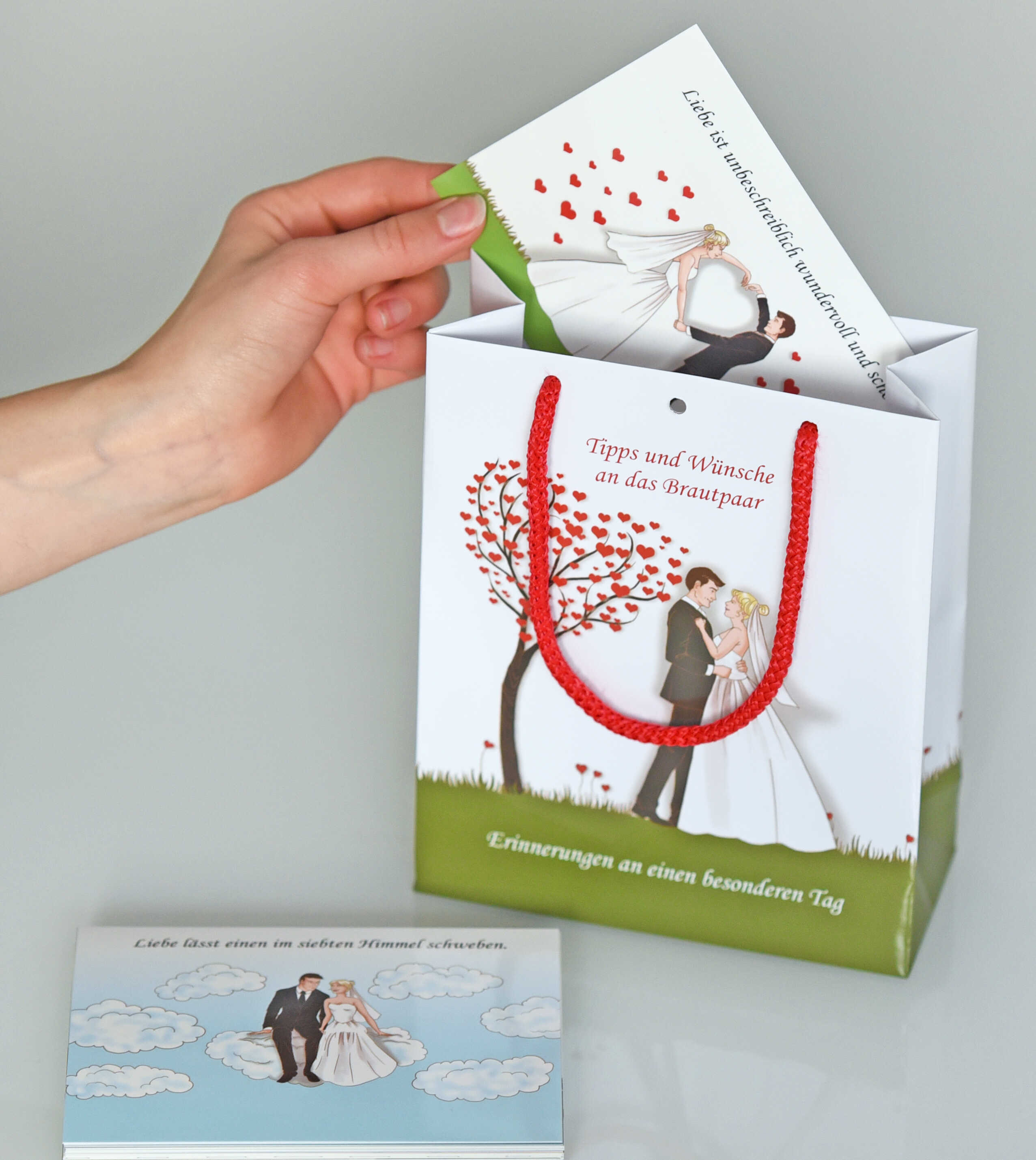 BESCHREIBBAR mit Kugelschreiber, Tintenroller, Füller, Fineliner usw. Ihre Gäste können individuell selbst gestalten und die unterschiedlichsten Ideen und Grüße auf die Karten schreiben und anschließend in die Tragetasche stecken.