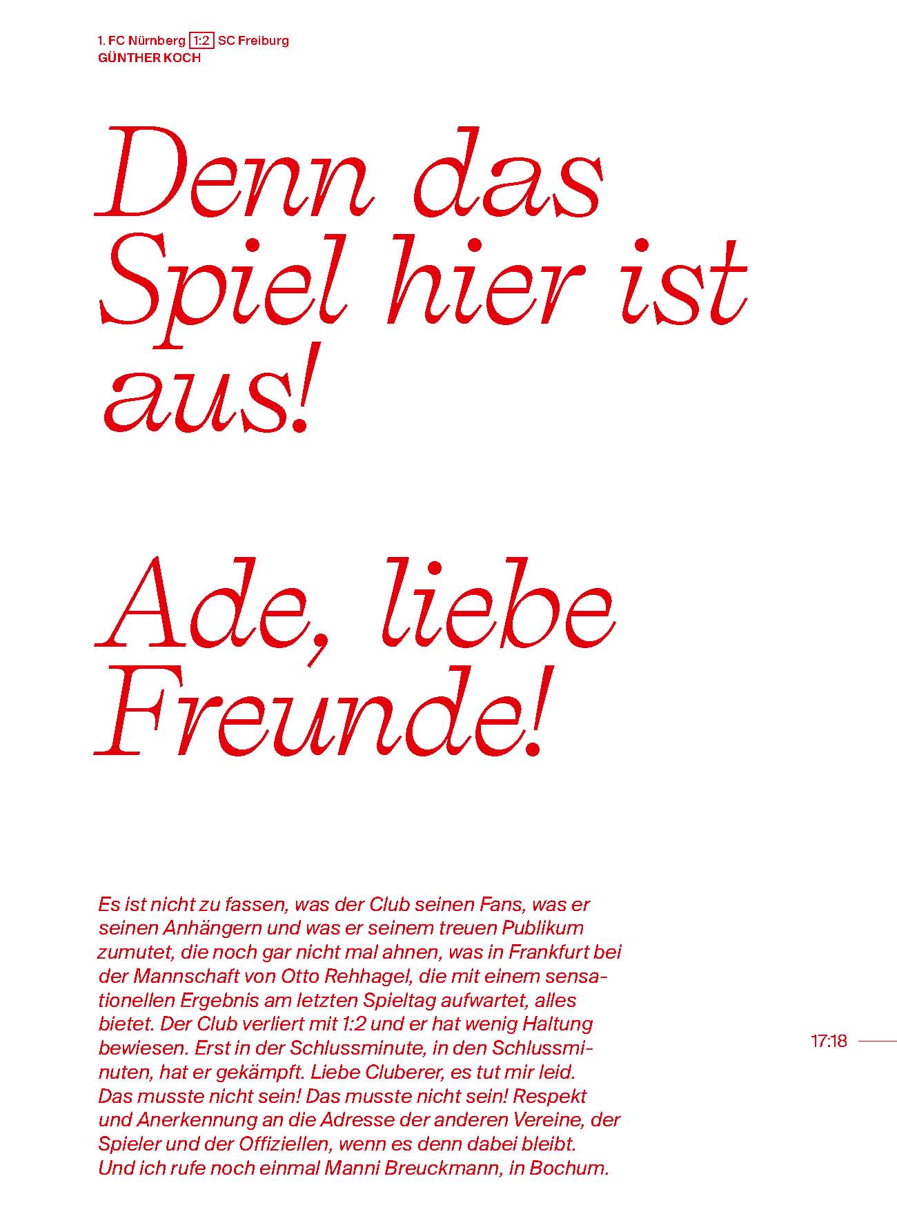 Es sind nicht in erster Linie Erfolge und Triumphe, welche die Liebe zu diesem Verein auszeichnen. Es ist der Mythos des gemeinsamen Scheiterns, der kollektiven Resilienzerfahrung einer ganzen Stadt. Und so vermag es der 1. FC Nürnberg wie kein Zweiter, eine bizarre Freude am Versagen zu wecken – ein Gefühl, das mit keinem Triumph der Welt aufgewogen werden kann. Nürnberg bedeutet gleichermaßen Himmel und Hölle, Wahnsinn und Ekstase, Lieben und Leiden. Durch diese innere Ambivalenz des eigenen Seins wird der großartige 1. FC Nürnberg niemals untergehen. Komme, was wolle.
