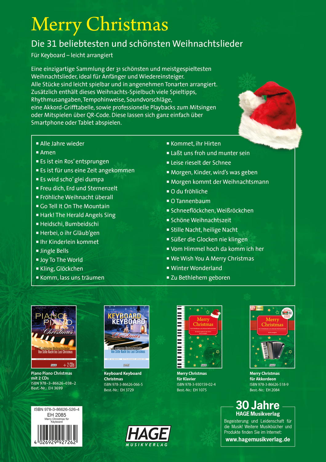 Eine einzigartige Sammlung der 31 schönsten und meistgespieltesten Weihnachtslieder, ideal für Anfänger und Wiedereinsteiger. Alle Stücke sind leicht spielbar und in angenehmen Tonarten arrangiert. Zusätzlich enthält dieses Weihnachts-Spielbuch viele Spieltipps, Rhythmusangaben, Tempohinweise, Soundvorschläge, eine Akkord-Grifftabelle, sowie professionelle Playbacks zum Mitsingen oder Mitspielen über QR-Code. Diese lassen sich ganz einfach über Smartphone oder Tablet abspielen.