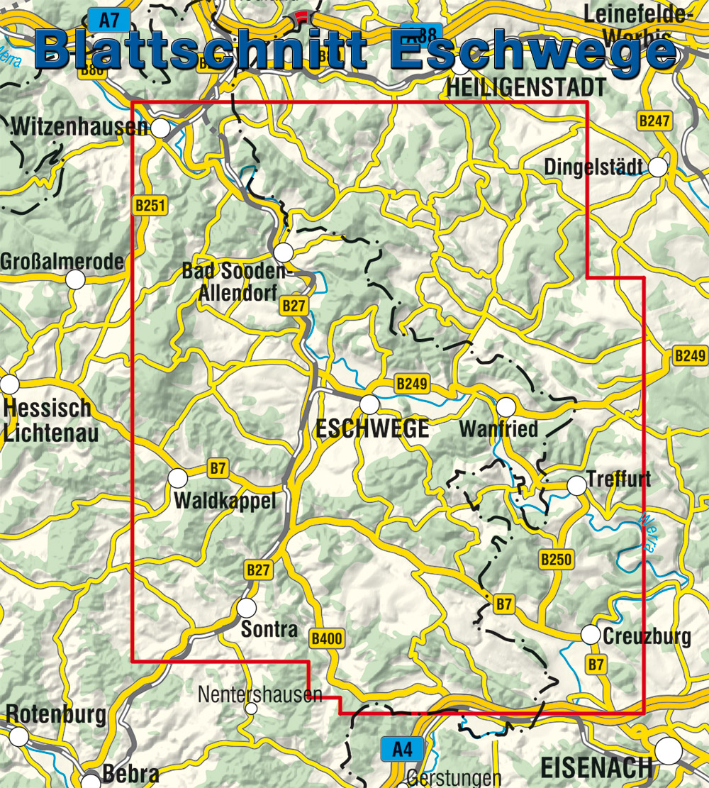 Naturschönheiten am Wegesrand, Aussichtskanzeln mit schönen Ausblicken, hervorragende Buchenwälder und eine artenreiche Flora und Fauna zeichnen die Region Eschwege mit dem Hohen Meißner, Meinhard und Wanfried aus.Berge, Burgen, Wald und Wasser stellen den Reiz dieser schönen Mittelgebirgslandschaft dar.In Zusammenarbeit mit den Wandervereinen, den Tourismusinformationen und der Naturparkverwaltung wurden vom Deutschen Wanderinstitut 19 Wanderwege mit dem Deutschen Wandersiegel ausgezeichnet. Sie garantieren beste Wanderqualität und Naturgenuss.19 Premiumwege wurden unter der Dachmarke ENTDECKERtouren Werratal zusammengefasst.Die neue wetterfeste Rad- und Wanderkarte Eschwege stellt die Region Witzenhausen - Bad Sooden-Allendorf - Eschwege - Wanfried - Sontra bis einschließlich Treffurt und Creuzburg mit dem vollständigen Rad- und Wanderwegenetz vor.Ein UTM-Gitter zur GPS-Nutzung und eine Geländeschummerung zur Visualisierung des Mittelgebirges runden das Angebot ab.