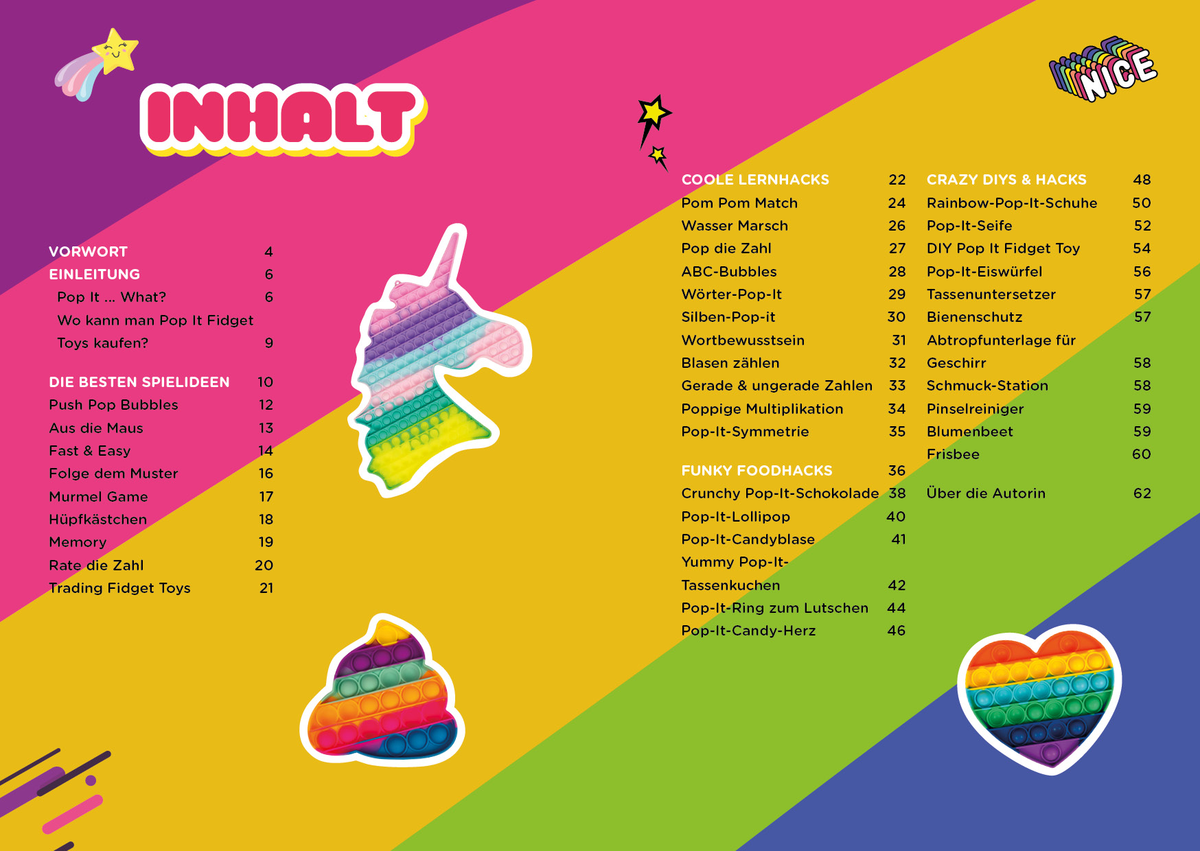 Mit diesem Buch wirst du zu zahlreichen Spielmöglichkeiten, Hacks und DIY-Projekten inspiriert. So kannst du dein Pop It nicht nur für das klassische Ploppen der Blasen benutzen, was übrigens Stress reduzieren kann, sondern es auch für selbst gemachte Schokolade, das Verschönern von Schuhen und zum Duellieren deines liebsten Mitschülers verwenden. Und - mega Fact! - es kann auch deinen strengsten Lehrer vom Mehrwert dieses Spielzeugs überzeugen, sodass kein Grund mehr besteht, es nicht in der Schule zu benutzen. Mit oberkrassen Lernhacks wird dein Spielzeug zur allerliebsten Rechenmaschine oder zum megabunten Buchstabenlehrwerk. Auf die Plätze - fertig - Pop!