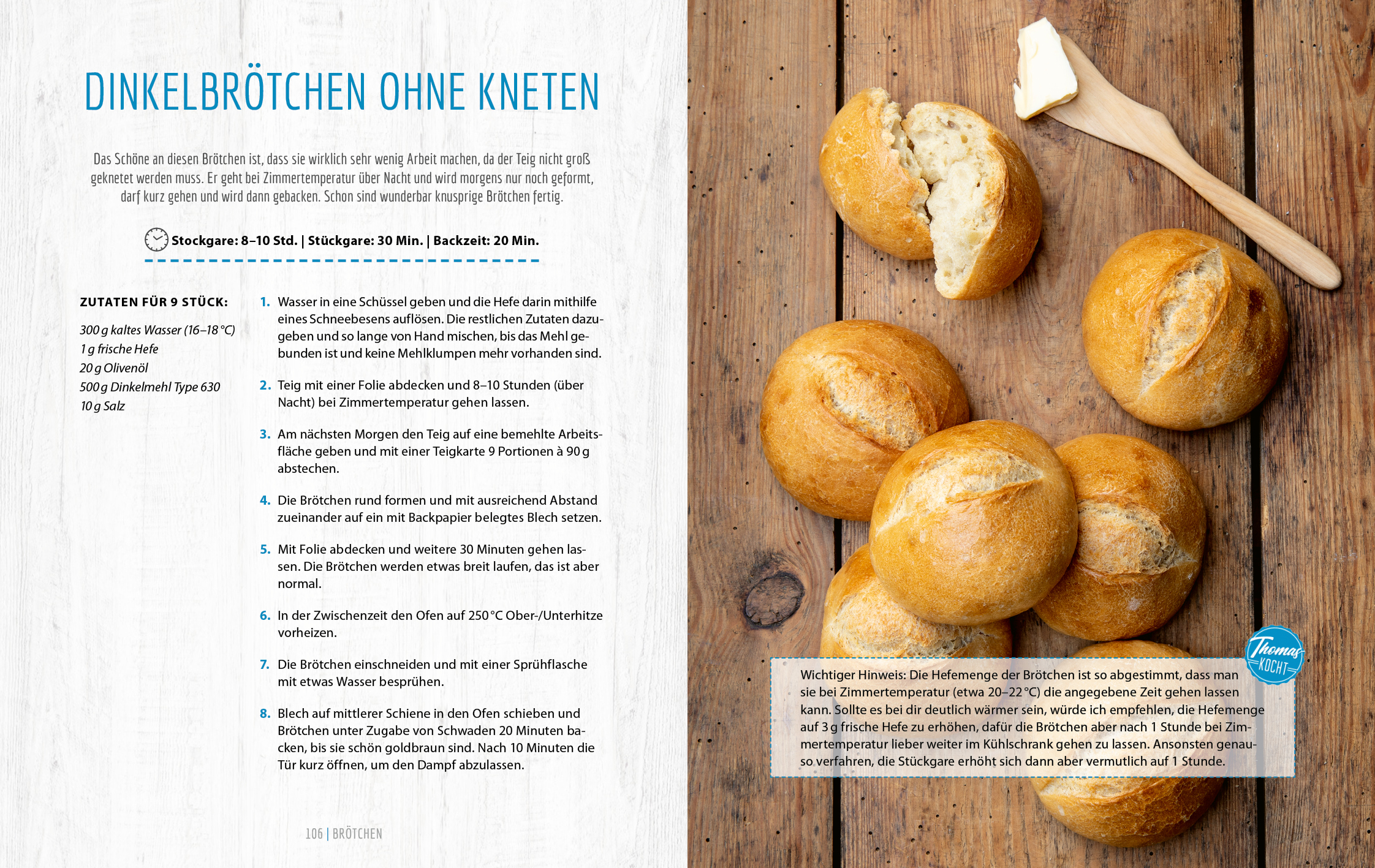 Der Profikoch Thomas Dippel vom YouTube-Kanal Thomas kocht zeigt in seinem zweiten Buch, wie man ganz einfach Brote mit Hefe, Sauerteigbrote oder Gebäck zubereitet. Die 50 Rezepte lassen sich wunderbar in den Alltag integrieren, da man nur wenige Zutaten benötigt, und sie sind sowohl für Anfänger als auch für Hobbybäcker geeignet. Von Bauernbrot über Dinkelbrot mit Buttermilch bis zu Bagels und Franzbrötchen ist alles dabei. Mit den besten Tipps und Tricks für gelingsicheres Backen.