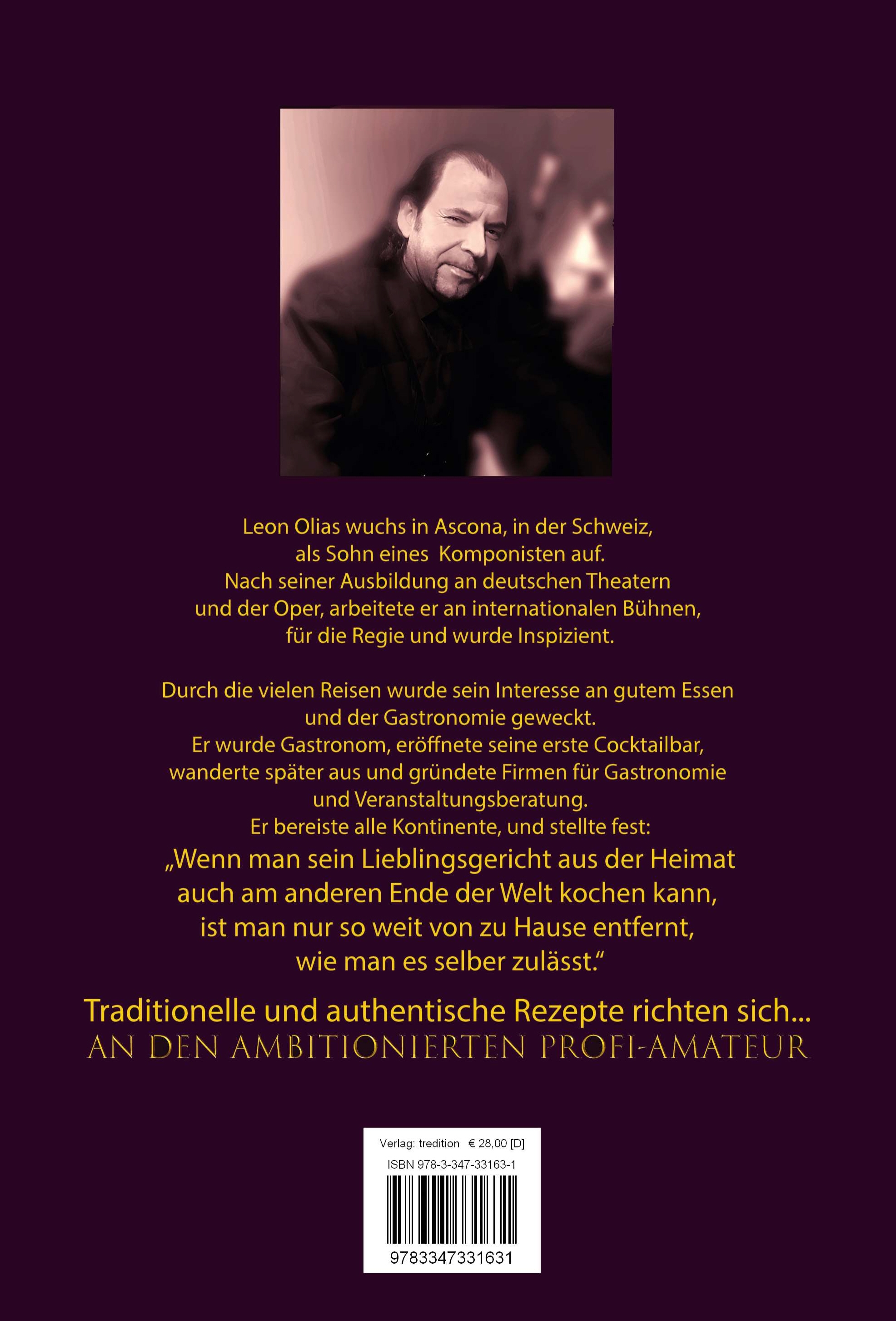 Deutsche , mediterrane, traditionelle und internationale Gerichte - einfach erklärt Auch ohne Lesebrille lesbar Der QR-Code zu jedem Gericht ersetzt den Einkaufszettel „Jeder kann kochen - Du auch“ Das Buch richtet sich an den ambitionierten Profi – Amateur Leon Olias wuchs in Ascona, in der Schweiz, als Sohn eines Komponisten auf. Nach seiner Ausbildung an deutschen Theatern und der Oper, arbeitete er an internationalen Bühnen, für die Regie und wurde Inspizient. Durch die vielen Reisen wurde sein Interesse an gutem Essen und der Gastronomie geweckt. Er wurde Gastronom, eröffnete seine erste Cocktailbar, wanderte später aus und gründete Firmen für Gastronomie und Veranstaltungsberatung. Er bereiste alle Kontinente, und stellte fest: „Wenn man sein Lieblingsgericht aus der Heimat auch am anderen Ende der Welt kochen kann, ist man nur so weit von zu Hause entfernt, wie man es selber zulässt.“