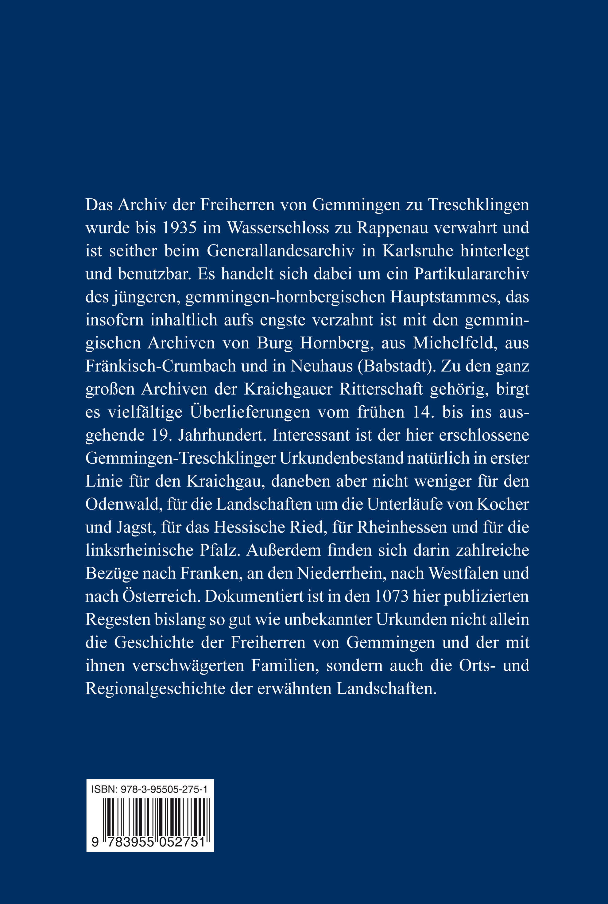 Das Archiv der Freiherren von Gemmingen zu Treschklingen wurde bis 1935 im Wasserschloss zu Rappenau verwahrt und ist seither beim Generallandesarchiv in Karlsruhe hinterlegt und benutzbar. Es handelt sich dabei um ein Partikulararchiv des jüngeren, gemmingen-hornbergischen Hauptstammes, das insofern inhaltlich aufs engste verzahnt ist mit den gemmingischen Archiven von Burg Hornberg, aus Michelfeld, aus Fränkisch-Crumbach und in Neuhaus (Babstadt). Zu den ganz großen Archiven der Kraichgauer Ritterschaft gehörig, birgt es vielfältige Überlieferungen vom frühen 14. bis ins ausgehende 19. Jahrhundert. Interessant ist der hier erschlossene Gemmingen-Treschklinger Urkundenbestand natürlich in erster Linie für den Kraichgau, daneben aber nicht weniger für den Odenwald, für die Landschaften um die Unterläufe von Kocher und Jagst, für das Hessische Ried, für Rheinhessen und für die linksrheinische Pfalz. Außerdem finden sich darin zahlreiche Bezüge nach Franken, an den Niederrhein, nach Westfalen und nach Österreich. Dokumentiert ist in den 1073 hier publizierten Regesten bislang so gut wie unbekannter Urkunden nicht allein die Geschichte der Freiherren von Gemmingen und der mit ihnen verschwägerten Familien, sondern auch die Orts- und Regionalgeschichte der erwähnten Landschaften.
