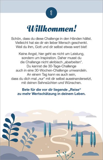 Mit dieser Challenge-Box können Sie sich spielend leicht verinnerlichen, wie Gott Sie sieht, und Sie lernen, sich selbst noch wertschätzender zu begegnen. Darüber hinaus bekommen Sie kreative Anregungen, wie Sie den Menschen in Ihrem Umfeld mit einfachen Mitteln wertschätzend begegnen können - mit Gott an Ihrer Seite.