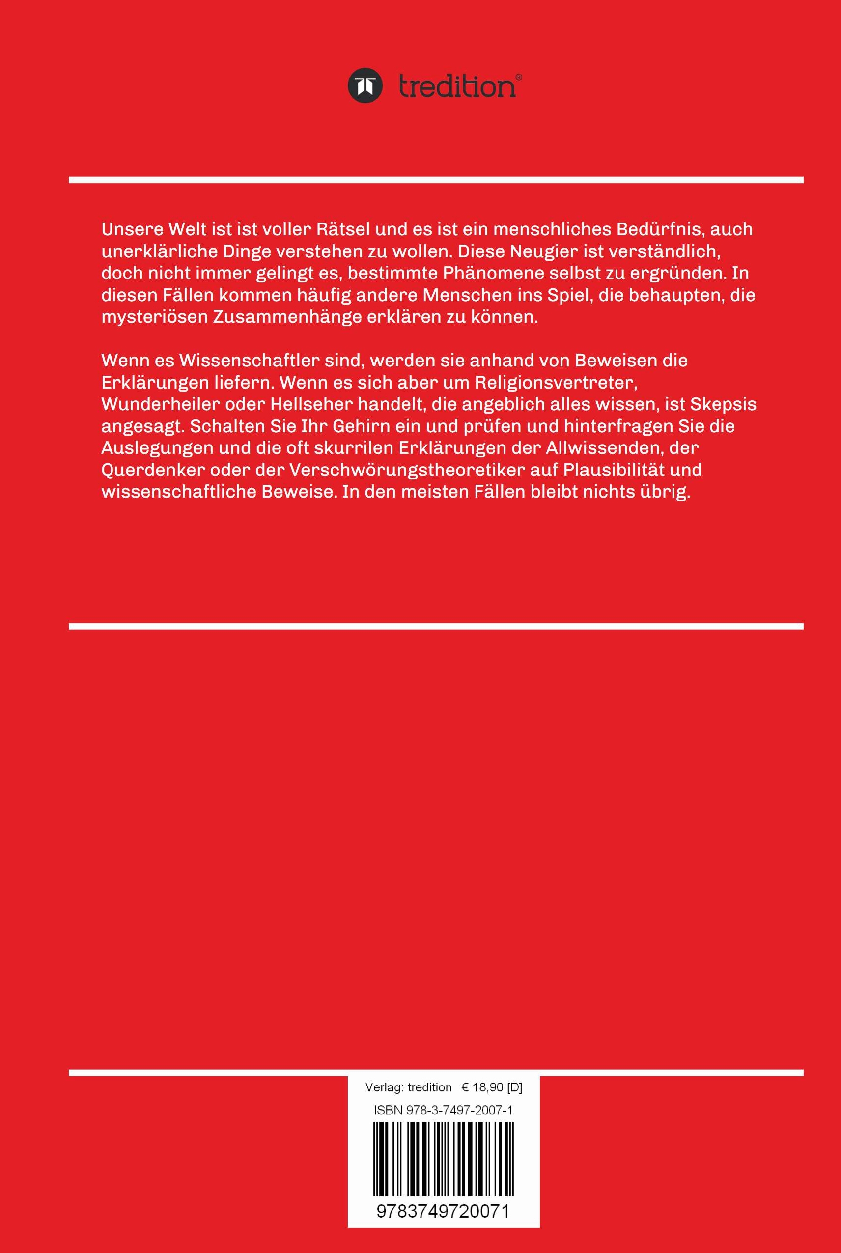 Unsere Welt ist ist voller Rätsel und es ist ein menschliches Bedürfnis, auch unerklärliche Dinge verstehen zu wollen. Diese Neugier ist verständlich, doch nicht immer gelingt es, bestimmte Phänomene selbst zu ergründen. In diesen Fällen kommen häufig andere Menschen ins Spiel, die behaupten, die mysteriösen Zusammenhänge erklären zu können.Wenn es Wissenschaftler sind, werden sie anhand von Beweisen die Erklärungen liefern. Wenn es sich aber um Religionsvertreter, Wunderheiler oder Hellseher handelt, die angeblich alles wissen, ist Skepsis angesagt. Schalten Sie Ihr Gehirn ein und prüfen und hinterfragen Sie die Auslegungen und die oft skurrilen Erklärungen der Allwissenden, der Querdenker oder der Verschwörungstheoretiker auf Plausibilität und wissenschaftliche Beweise. In den meisten Fällen bleibt nichts übrig.