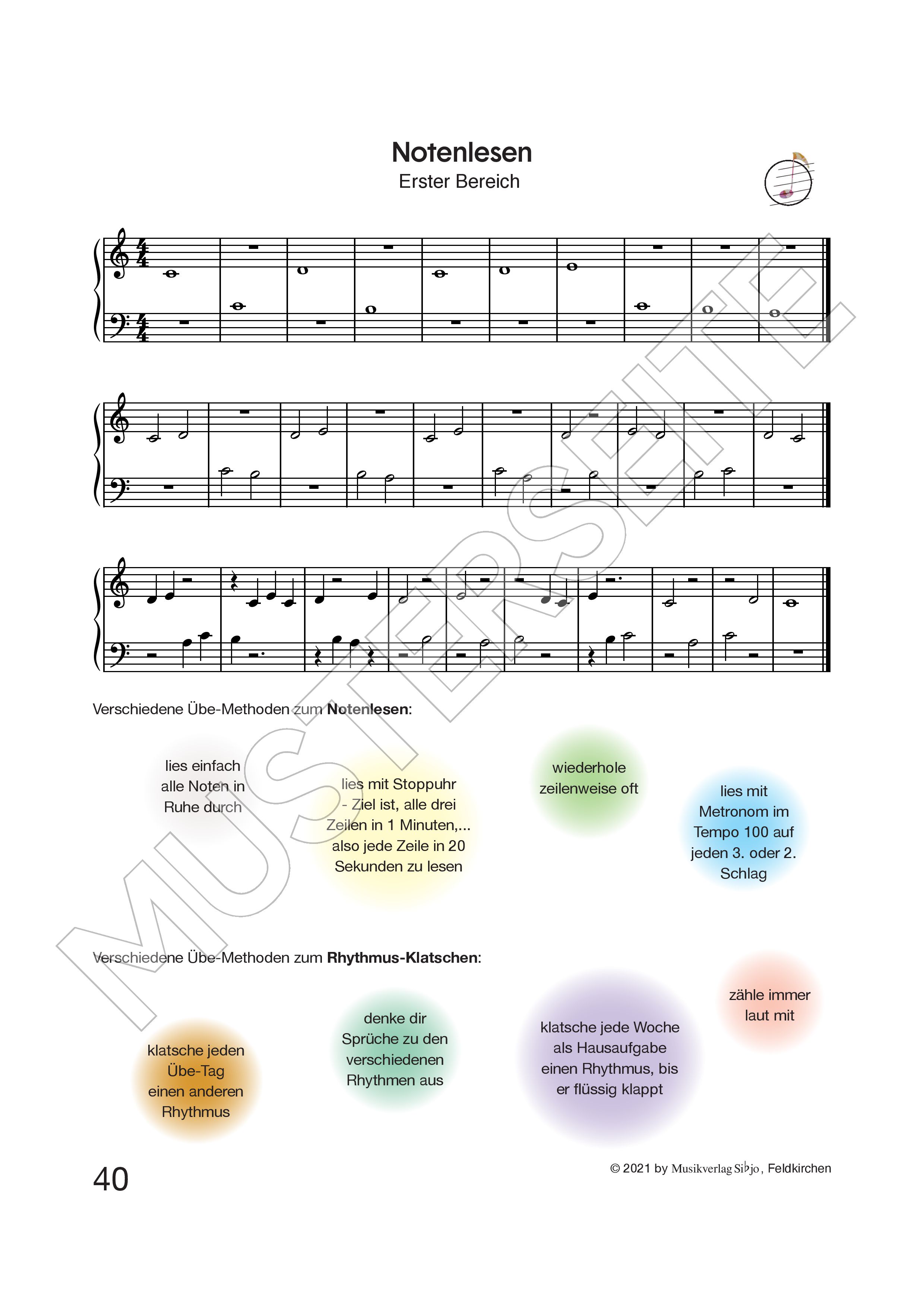 Der erste kleine Notenraum soll sicher erlesen und erspielt werden können, Notenwerte verstanden, das musikalische Gehör durch Mitsingen geschult und das Auseinandersetzen mit Gestaltung der Stücke in Bezug auf Dynamik angeregt werden. Technisch wird der Anschlag gefestigt und die Lockerheit des Handgelenks geübt.