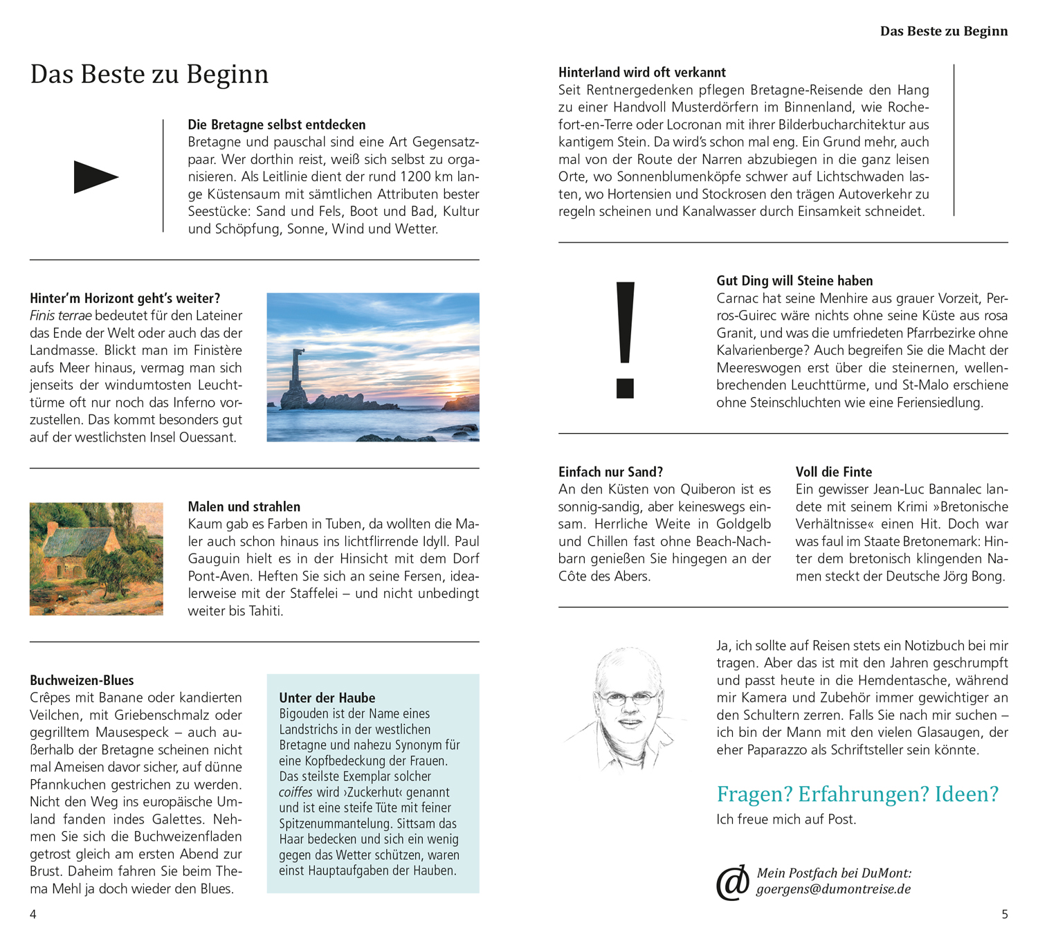 Das Beste zu Beginn. Das ist die Bretagne. Die Bretagne in Zahlen. So schmeckt die Bretagne. Ihr Bretagne-Kompass: Rennes und sein Hinterland, die Südküste, der äußerste Westen und die Nordküste. Hin & Weg. O-Ton Bretagne. Kennen Sie die?