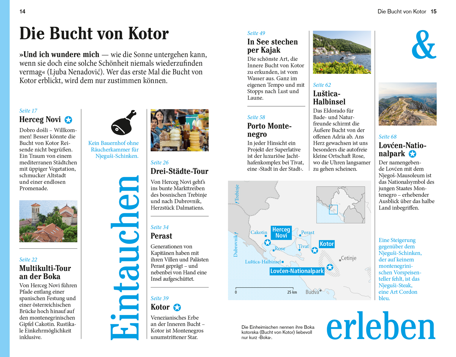 Senkrechtstarter, Überflieger, Querfeldein. Vor Ort - die Kapitel: Die Bucht von Kotor, Adriaküste zwischen Budva und Albanien, Podgorica und Umgebung, Der Nordwesten, Der Nordosten. Das Kleingedruckte (Reiseinfos von A bis Z). Das Magazin. Offene Fragen.