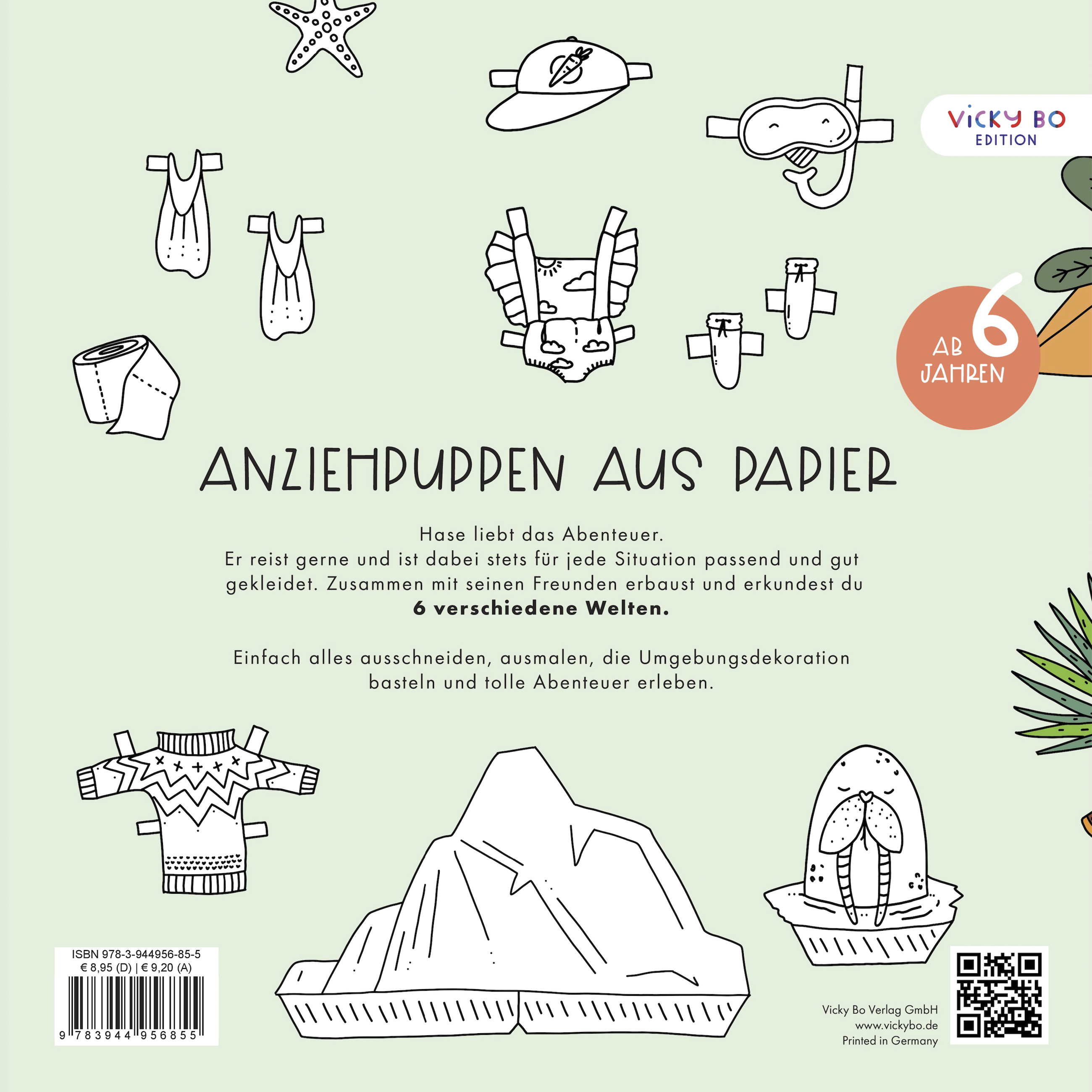 Anziehpuppen aus Papier. Abenteuerwelten zum Ausschneiden, Ausmalen und Basteln für KinderIn diesem Bastelbuch im Großformat findest du 'Hase', eine süße Anziehpuppe aus Papier. Er liebt das Abenteuer und reist sehr gerne. Du kannst für ihn und seine Freunde 6 verschiedene Welten aus Papier basteln. Dafür stehen dir viele passende Outfits, Accessoires und Gegenstände zum Ausschneiden und Falten zur Verfügung. Du reist zusammen mit dem Hasen und Katze Kitti durchs Weltall. Ihr geht mit Leppo auf Dschungelexpedition und grillt gemeinsam mit dem Bären Marshmallows am Lagerfeuer. Mit Pingu erlebst du das ewige Eis und in der Wüste reitet ihr gemeinsam auf einem Kamel. Der Fantasie werden keine Grenzen gesetzt und die Welten lassen sich mit eigenen Basteleien und selbst gezeichneter Dekoration wunderbar ergänzen. Du kannst für die Freunde fantastische Geschichten und Abenteuer erfinden.In diesem Buch können Kinder ihre Kreativität voll ausleben. Neben den vielen Ausschneide-Elementen liefert dieses Bastelbuch viel Inspiration für eigene Kreationen und Erweiterungen.- Großformat 30 x 30 cm- Dickes und hochwertiges Naturoffset-Papier weiß (170g/m2)- Illustriert von Anna-Kristina Schröder-Klasen im Jahr 2021- In Deutschland gedruckt