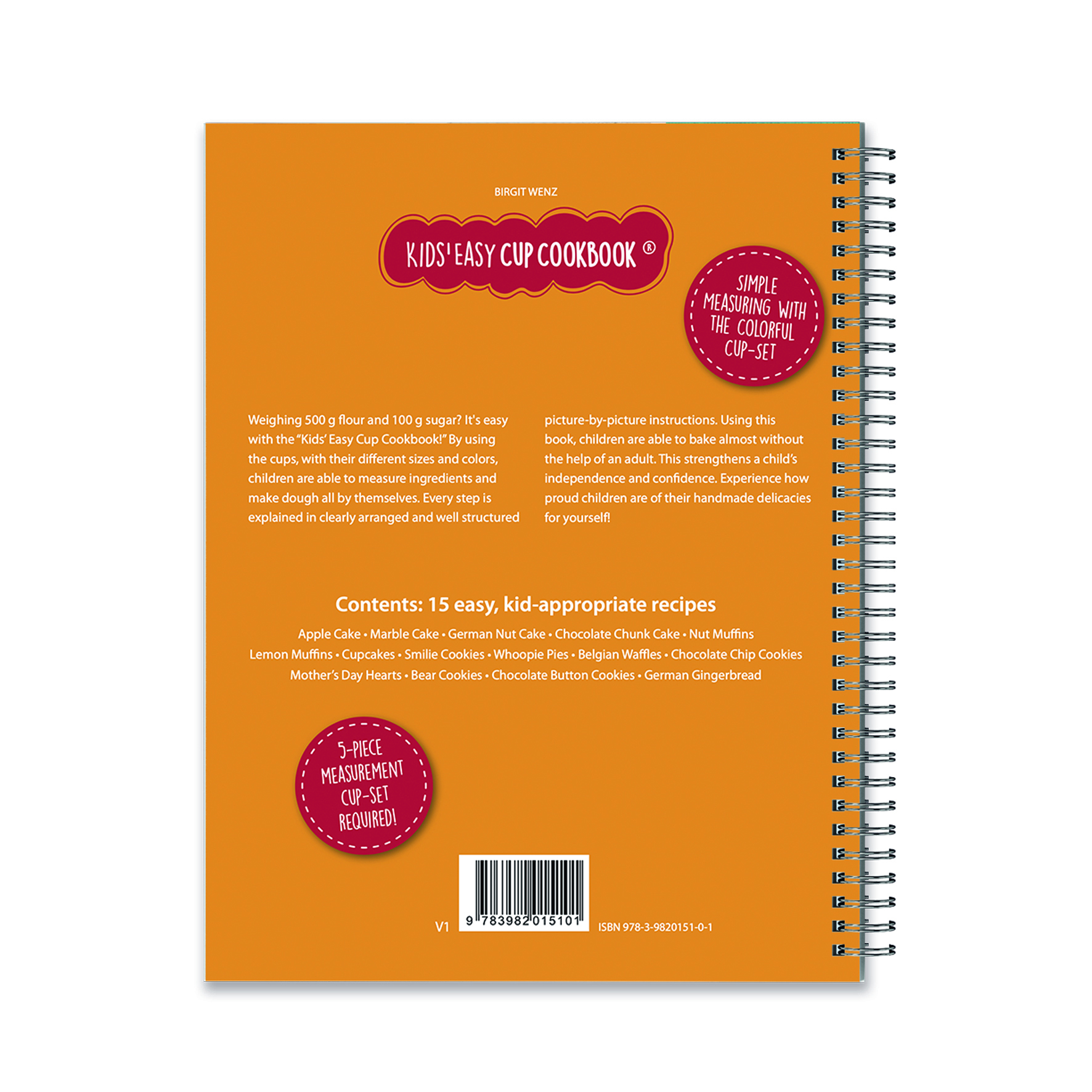 | Zusatzinfo | The "Kids Easy Cup Cookbook" a baking book for children from 4 years of age with detailed picture-by-picture instructions in which every single step is illustrated. The ingredients are measured with a colored measuring cup. |
