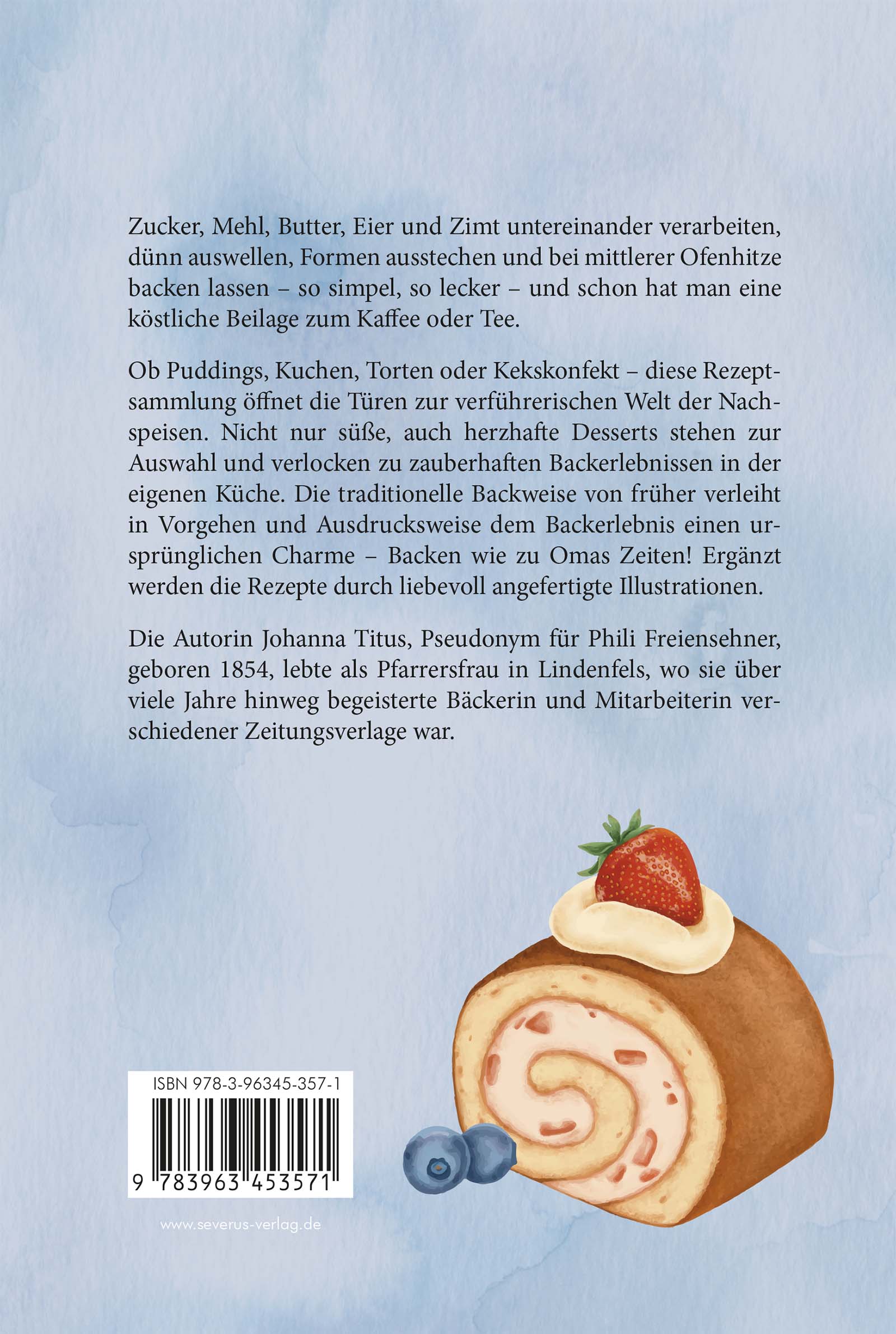 Zucker, Mehl, Butter, Eier und Zimt untereinander verarbeiten, dünn auswellen, Formen ausstechen und bei mittlerer Ofenhitze backen lassen - so simpel, so lecker - und schon hat man eine köstliche Beilage zum Kaffee oder Tee. Ob Puddings, Kuchen, Torten oder Kekskonfekt - diese Rezeptsammlung öffnet die Türen zur verführerischen Welt der Nachspeisen. Nicht nur süße, auch herzhafte Desserts stehen zur Auswahl und verlocken zu zauberhaften Backerlebnissen in der eigenen Küche. Die traditionelle Backweise von früher verleiht in Vorgehen und Ausdrucksweise dem Backerlebnis einen ursprünglichen Charme - Backen wie zu Omas Zeiten! Ergänzt werden die Rezepte durch liebevoll angefertigte Illustrationen. Die Autorin Johanna Titus, Pseudonym für Phili Freiensehner, geboren 1854, lebte als Pfarrersfrau in Lindenfels, wo sie über viele Jahre hinweg begeisterte Bäckerin und Mitarbeiterin verschiedener Zeitungsverlage war.