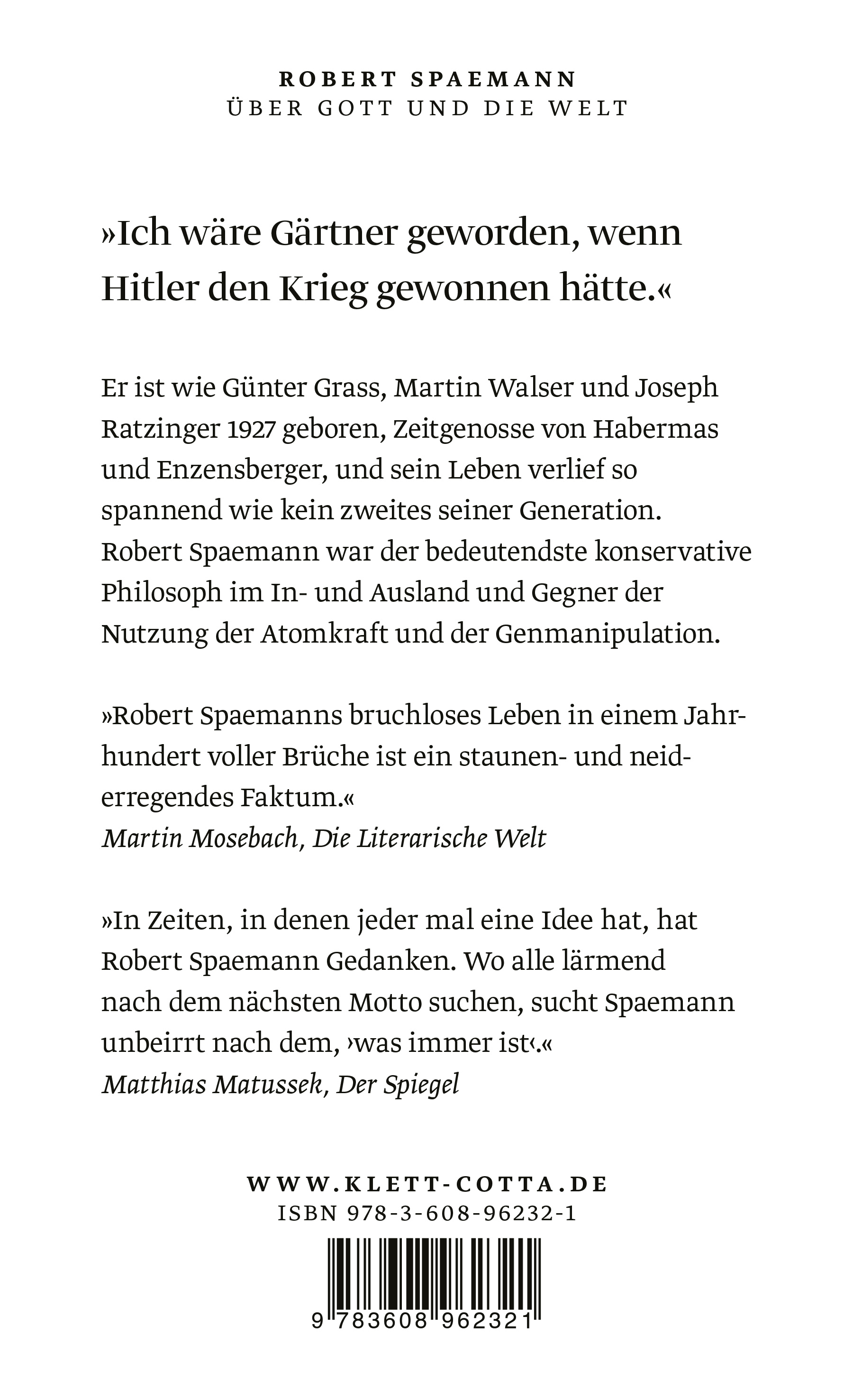 Robert Spaemann, geboren am 5. Mai 1927 in Berlin, studierte Philosophie, Romanistik und Theologie in Münster, München und Fribourg. Von 1962 bis 1992 lehrte er Philosophie an den Universitäten in Stuttgart, Heidelberg und München, wo er 1992 emeritiert wurde. Robert Spaemann hatte zahlreiche Gastprofessuren inne, erhielt mehrere Ehrendoktorwürden und war 2001 der Träger des Karl-Jaspers-Preises der Stadt und der Universität Heidelberg. Robert Spaemann, einer der führenden konservativen Philosophen im deutschsprachigen Raum, starb am 10. Dezember 2018.