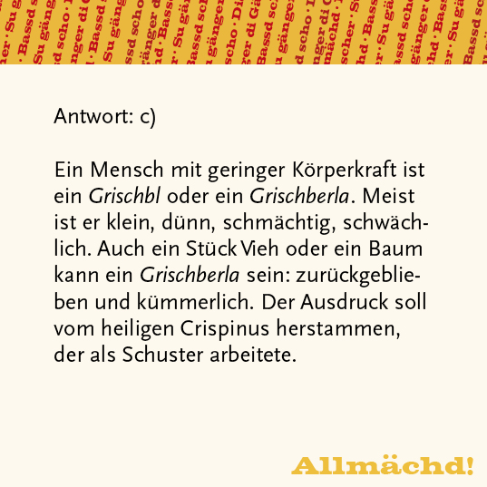 | Schlagworte | allgemeinbildung quiz • allgemeinwissen quiz • Allmächd • deutsch fränkisch • Dialekt • Dialekte • dialekte deutschland • dialekte in deutschland • dialekte quiz • dialekt fränkisch • dialekt quiz • Erwachsenenspiele • Frage Antwort • frage antwort spiel • Fragekarten • Fragen • Fragen und Antworten • fragen und antworten spiel • Fragespiel • Frage und Antwort • frängisch • Franke • Franken • franken dialekt • Frankenland • franken sprache • Fränkisch • fränkisch deutsch • fränkisch dialekt • fränkisch Duden • fränkische ausdrücke • Fränkische Mundart • fränkischer akzent • Fränkischer Dialekt • fränkischer dialekt text • fränkischer dialekt wörter • fränkischer dialekt wörterbuch • fränkische Redewendungen • Fränkische Sprache • Fränkisches Wörterbuch • fränkische worte • fränkische Wörter • Fränkisch für Anfänger • fränkisch lernen • fränkisch nürnberg • fränkisch reden • fränkisch Übersetzer • fränkisch wörterbuch • Gastgeschenk • gastgeschenke • geburtstag geschenke • Geburtstagsgeschenke • geburtstagsgeschenke für männer • geburtstagsgeschenke ideen • Geburtstagsgeschenk Freundin • geburtstagsgeschenk mann • Geschenk • Geschenke • geschenke freundin • geschenke für die beste freundin • Geschenke für Eltern • Geschenke für Frauen • Geschenke für Freund • geschenke für freundin • geschenke für mama • geschenke für mann • Geschenke für Männer • Geschenke für Oma und Opa • geschenke für opa • geschenke für papa • Geschenke für Väter • geschenke großeltern • geschenke männer • Geschenke zum Geburtstag • geschenke zu weihnachten • geschenk für ehemann • Geschenk für Freund • geschenk für meinen freund • Geschenk für Partner • Geschenk für Vater • Geschenkideen • geschenkideen freund • Geschenkideen Freundin • Geschenkideen für Männer • geschenkideen männer • geschenkideen oma und opa • Geschenkideen Weihnachten • geschenk mitbringsel • Geschenk Opa • Gesellschaftsspiele • gesellschaftsspiele erwachsene • gesellschaftsspiele für erwachsene • in franken • kartenspiele für erwachsene • kleine gastgeschenke • Kleine Geschenke • kleine geschenke für männer • kleine ostergeschenke • Lokalkolorit • lustige fragen und antworten • lustige fränkische sätze • lustige fränkische wörter • lustige Geschenke • lustige Geschenke für Männer • lustige geschenkideen • lustige gesellschaftsspiele • männer geschenke • Männergeschenke • Mitbringsel • Mittelfranken • Mundart • Nürnberg • nürnberg dialekt • Nürnberger Dialekt • Oma Opa Geschenk • Opa Geschenk • party spiele erwachsene • partyspiele erwachsene • partyspiele für erwachsene • Quiz • quiz allgemeinbildung • quiz fragen • Quizfragen • quizfragen mit antworten • quiz fragen und antworten • quizfragen und antworten • quiz kartenspiel • Quizspiel • quiz spiele • Quizspiele • quiz spiele für erwachsene • Raten • ratequiz für erwachsene • Ratespiel • Rätsel • Rätseln • Rätselspaß • Rätselspiele • Reisespiele • Spiel • spiele für 2 erwachsene • Spiele für Erwachsene • spiele für zwei erwachsene • spiele quiz • spiel erwachsene • Spielkarten • typisch fränkisch • typisch fränkische wörter • typisch fränkisch wörter • Unterfranken • Weihnachtsgeschenke • Weihnachtsgeschenk Freund • Weihnachtsgeschenkideen • Wissensquiz • wissensquiz spiel • witzige Geschenke • wörterbuch fränkisch • Wortschatz |