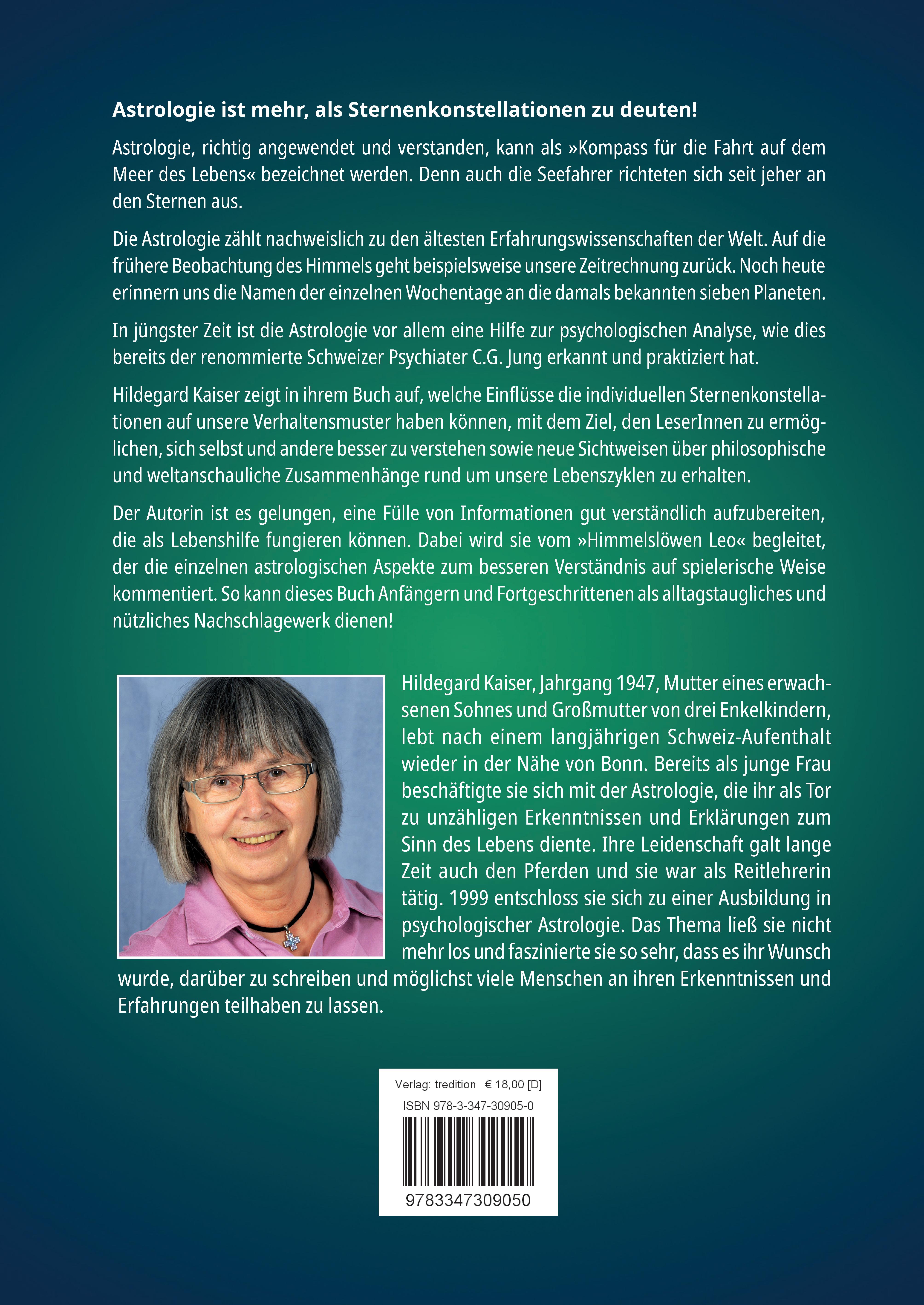 Astrologie ist mehr, als Sternenkonstellationen zu deuten! Astrologie, richtig angewendet und verstanden, kann als »Kompass für die Fahrt auf dem Meer des Lebens« bezeichnet werden. Denn auch die Seefahrer richteten sich seit jeher an den Sternen aus. Die Astrologie zählt nachweislich zu den ältesten Erfahrungswissenschaften der Welt. Auf die frühere Beobachtung des Himmels geht beispielsweise unsere Zeitrechnung zurück. Noch heute erinnern uns die Namen der einzelnen Wochentage an die damals bekannten sieben Planeten. In jüngster Zeit ist die Astrologie vor allem eine Hilfe zur psychologischen Analyse, wie dies bereits der renommierte Schweizer Psychiater C.G. Jung erkannt und praktiziert hat. Hildegard Kaiser zeigt in ihrem Buch auf, welche Einflüsse die individuellen Sternenkonstellationen auf unsere Verhaltensmuster haben können, mit dem Ziel, den LeserInnen zu ermöglichen, sich selbst und andere besser zu verstehen sowie neue Sichtweisen über philosophische und weltanschauliche Zusammenhänge rund um unsere Lebenszyklen zu erhalten. Der Autorin ist es gelungen, eine Fülle von Informationen gut verständlich aufzubereiten, die als Lebenshilfe fungieren können. Dabei wird sie vom »Himmelslöwen Leo« begleitet, der die einzelnen astrologischen Aspekte zum besseren Verständnis auf spielerische Weise kommentiert. So kann dieses Buch Anfängern und Fortgeschrittenen als alltagstaugliches und nützliches Nachschlagewerk dienen!