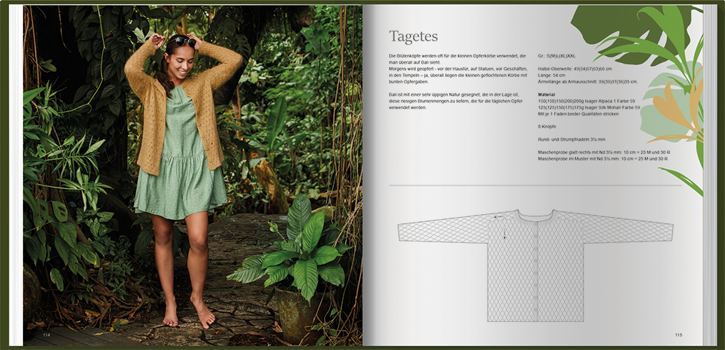 Kuschelige Strickwesten im Blau der Fischschwärme, Pullover in sattem Dschungel-Grün oder ein Cardigan im leuchtenden Orange der Tagetes-Blüten: Farben und Muster spielen bei den Strickmodellen von Annette Danielsen die Hauptrolle. Fangen Sie die Magie der Natur und Kultur der indonesischen Insel ein und stricken Sie sich ein Stück Bali!