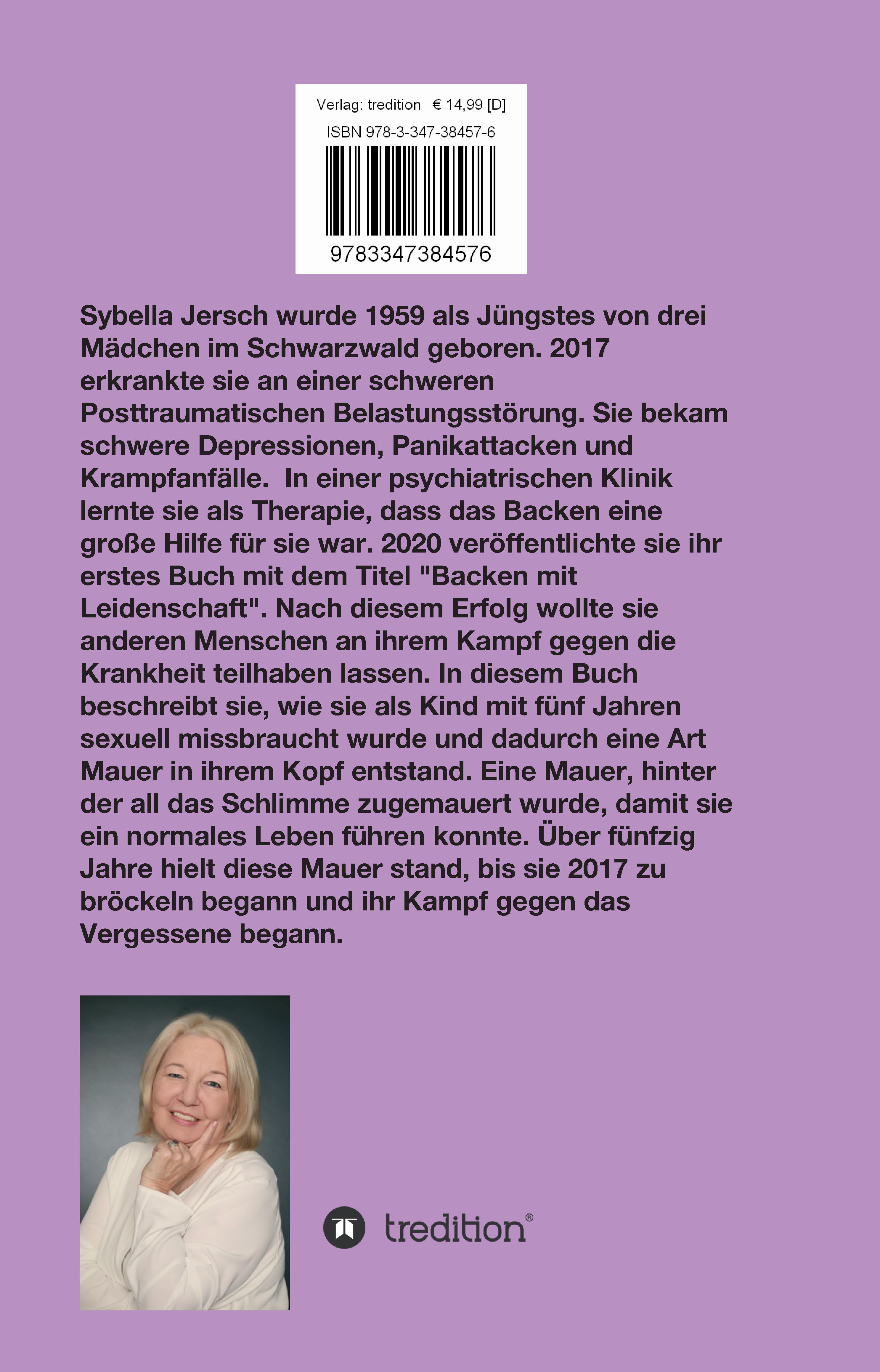 Sybella Jersch wurde 1959 als Jüngstes von drei Mädchen im Schwarzwald geboren. 2017 erkrankte sie an einer schweren Posttraumatischen Belastungsstörung. Sie bekam schwere Depressionen, Panikattacken und Krampfanfälle. In einer psychiatrischen Klinik war das Backen als Therapie eine große Hilfe. 2020 veröffentlichte sie ihr erstes Buch mit dem Titel "Backen mit Leidenschaft". Nach diesem Erfolg wollte sie anderen Menschen an ihrem Kampf gegen die Krankheit teilhaben lassen. In diesem Buch beschreibt sie, wie sie als Kind mit fünf Jahren sexuell missbraucht wurde und dadurch eine Art Mauer in ihrem Kopf entstand. Eine Mauer, hinter der all das Schlimme zugemauert wurde, damit sie ein normales Leben führen konnte. Über fünfzig Jahre hielt diese Mauer stand, bis sie 2017 zu bröckeln begann und ihr Kampf gegen das Vergessene begann.