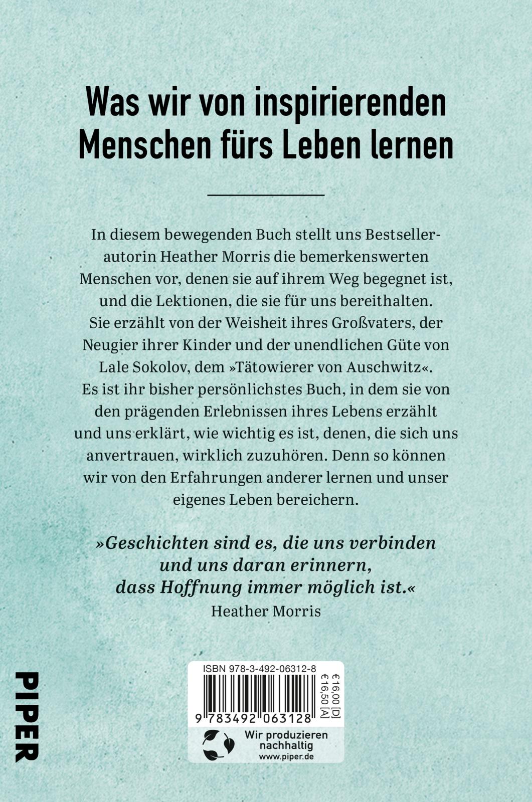 In diesem inspirierenden Handbuch für das Leben präsentiert Heather Morris die Geschichten der bemerkenswerten Menschen, denen sie auf ihrem Weg begegnet ist, und die Lektionen, die sie für uns bereithalten. Sie erzählt von der Weisheit ihres Großvaters, der Neugier ihrer Kinder und der unendlichen Güte von Lale Sokolov, dem „Tätowierer von Auschwitz“. Es ist ihr bisher persönlichstes Buch, in dem sie von den prägenden Erlebnissen ihres Lebens erzählt, und wie sie gelernt hat, denen, die sich ihr anvertrauen, wirklich zuzuhören – eine Fähigkeit, die wir ihrer Meinung nach alle lernen können.