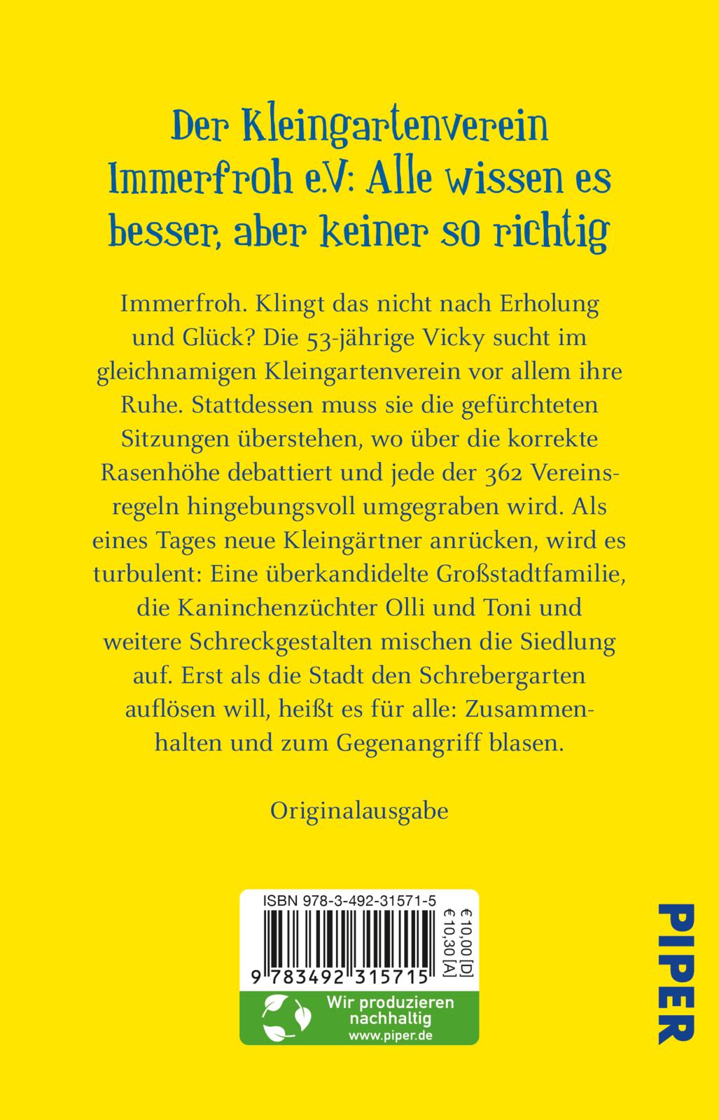 Immerfroh - klingt das nicht nach Erholung und Glück? Vicky, 53, sucht im gleichnamigen Kleingartenverein vor allem ihre Ruhe. Stattdessen muss sie Debatten über korrekte Rasenhöhe und die gefürchteten Vereinssitzungen überstehen, wo jede der 362 Regeln hingebungsvoll umgegraben wird. Als eines Tages neue Kleingärtner anrücken, wird es turbulent: Eine überkandidelte Großstadtfamilie, die Kaninchenzüchter Olli und Toni und weitere Schreckgestalten mischen die Siedlung auf. Erst als die Stadt Immerfroh auflösen will, heißt es für alle: Zusammenhalten und zum Gegenangriff blasen. Ob das gut geht?