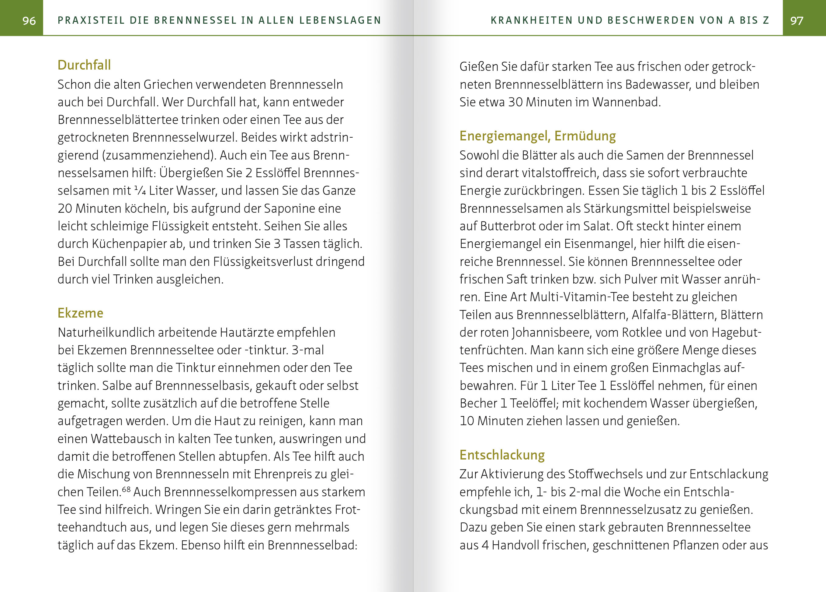 AUSZUG aus dem Praxisteil "Die Brennnessel in allen Lebenslagen":DIE BRENNNESSEL ALS HEILPFLANZESchon vor Jahrtausenden wurde die Brennnessel für medizinische Zwecke genutzt, etwa im alten Ägypten, bei den alten Griechen und Römern. Im Griechischen Kräuterbuch aus dem Jahr 512 vor Christi Geburt heißt es: "Die Pflanze heilt Wunden, die durch Hundebiss entstanden sind, und hilft bei gut- und bösartigen Geschwüren ... Brennnesselsaft ist hilfreich bei Nasenbluten. Brennnesseln helfen zusammen mit Myrrhe bei Menstruationsbeschwerden. Wer Brennnesseln zusammen mit Honig zu sich nimmt, lindert Unterleibsblutung und Lungenentzündung ... Ein Auszug, getrunken mit etwas Myrrhe, fördert die Menses und hilft bei Entzündungen der Gebärmutter".Weil die Brennnesseln auch bei so vielen Beschwerden helfen, die allein Frauen betreffen, zweifle ich daran, dass sie eine reine Marspflanze sein soll aufgrund ihrer Wehrhaftigkeit und ihres hohen Eisengehalts - sicherlich hat sie auch eine innere Verbindung zur Venus.KRANKHEITEN UND BESCHWERDEN VON A BIS ZIch stelle Ihnen im Folgenden Heilwirkungen vor - mit Angabe, welche Art von Zubereitung welches Pflanzenteils für die jeweilige Indikation am wirksamsten ist. Es ist gut, dass alte Heilmittel wie die Brennnessel gerade eine Renaissance erleben. Viele schulmedizinische Medikamente wie Antibiotika bringen gravierende Nebenwirkungen mit sich. Antibiotika lassen die physiologische Darmflora verarmen, und es können sich Resistenzen bilden. Etwa 80 Prozent unseres Immunsystems sind im Darm angesiedelt. Wer prophylaktisch Brennnesselprodukte zu sich nimmt - als natürliche Nahrungsergänzungsmittel -, stärkt durch die wertvollen Inhaltsstoffe sein Immunsystem. Brennnesseln gibt es bei uns schon länger, als es Menschen gibt. Wir sind also genetisch bestens an dieses Heilkraut angepasst."Gegen jede Krankheit ist ein Kraut gewachsen", heißt es. Bei der Brennnessel kann man eher sagen: Dieses Kraut hilft bei so gut wie jeder Krankheit! Rudolf Steiner nannte sie daher "Allerweltskerl" und "Königin der Beikräuter". Die Brennnessel wird im Nine Herbs Charm, dem auf Altenglisch verfassten Neunkräutersegen, als Pflanze bezeichnet, die "das Elend vertreibt", "mächtig ist gegen Vergiftung", "mächtig ist gegen Infektionen" und "Pflanze, die gegen den Wurm gekämpft hat". Schon Sebastian Kneipp (1821-1897) war voll des Lobes: "Die Brennnessel hat in der Tat für Kenner den besten Wert", und der Schweizer Kräuterpfarrer Johann Künzle sagte im 19. Jahrhundert: "Hätte die Brennnessel keine Stacheln, wäre sie schon längst ausgerottet worden, so vielseitig sind ihre Tugenden." Seine Bücher missfielen einigen Ärzten, die seine Arbeit juristisch verhindern wollten.Maria Treben (1907-1991) und ihre Familie tranken täglich Brennnesseltee als Gesundheitsvorsorge und wurden so gut wie nie krank. Die Heilkundige schrieb: "Niemals kann sich Bösartiges bilden, wenn wir unsere gute Brennnessel nicht nur ehren, sondern in regelmäßigen Abständen uns ihre wunderbare Kraft in Form von Tee einverleiben." Der französische Pflanzenheilkundler Maurice Mességué (1921-2017) schwärmte von der Brennnessel: "Wenn man mir sagen würde, ich dürfte nur eine einzige Heilpflanze sammeln, dann wäre es zweifellos die Brennnessel." (...)