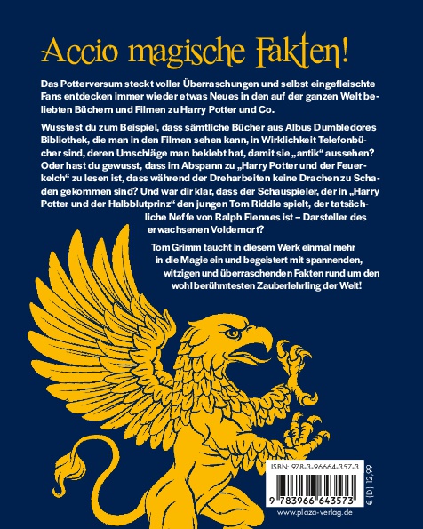 Accio magische Fakten!Das Potterversum steckt voller Überraschungen und selbst eingefleischte Fans entdecken immer wieder etwas Neues in den auf der ganzen Welt beliebten Büchern und Filmen zu Harry Potter und Co.Wusstest du zum Beispiel, dass sämtliche Bücher aus Albus Dumbledores Bibliothek, die man in den Filmen sehen kann, in Wirklichkeit Telefonbücher sind, deren Umschläge man beklebt hat, damit sie "antik" aussehen?Oder hast du gewusst, dass im Abspann zu "Harry Potter und der Feuerkelch" zu lesen ist, dass während der Dreharbeiten keine Drachen zu Schaden gekommen sind? Und war dir klar, dass der Schauspieler, der in "Harry Potter und der Halbblutprinz" den jungen Tom Riddle spielt, der tatsächliche Neffe von Ralph Fiennes ist - Darsteller des erwachsenen Voldemort?Tom Grimm taucht in diesem Werk einmal mehr in die Magie ein und begeistert mit spannenden, witzigen und überraschenden Fakten rund um den wohl berühmtesten Zauberlehrling der Welt! Egal ob für dich selbst oder als Geschenk - dieses liebevoll aufgemachte Buch ist für jeden Harry-Potter-Leser ein Muss! Die ultimative Wissenssammlung für Potter-Fans!