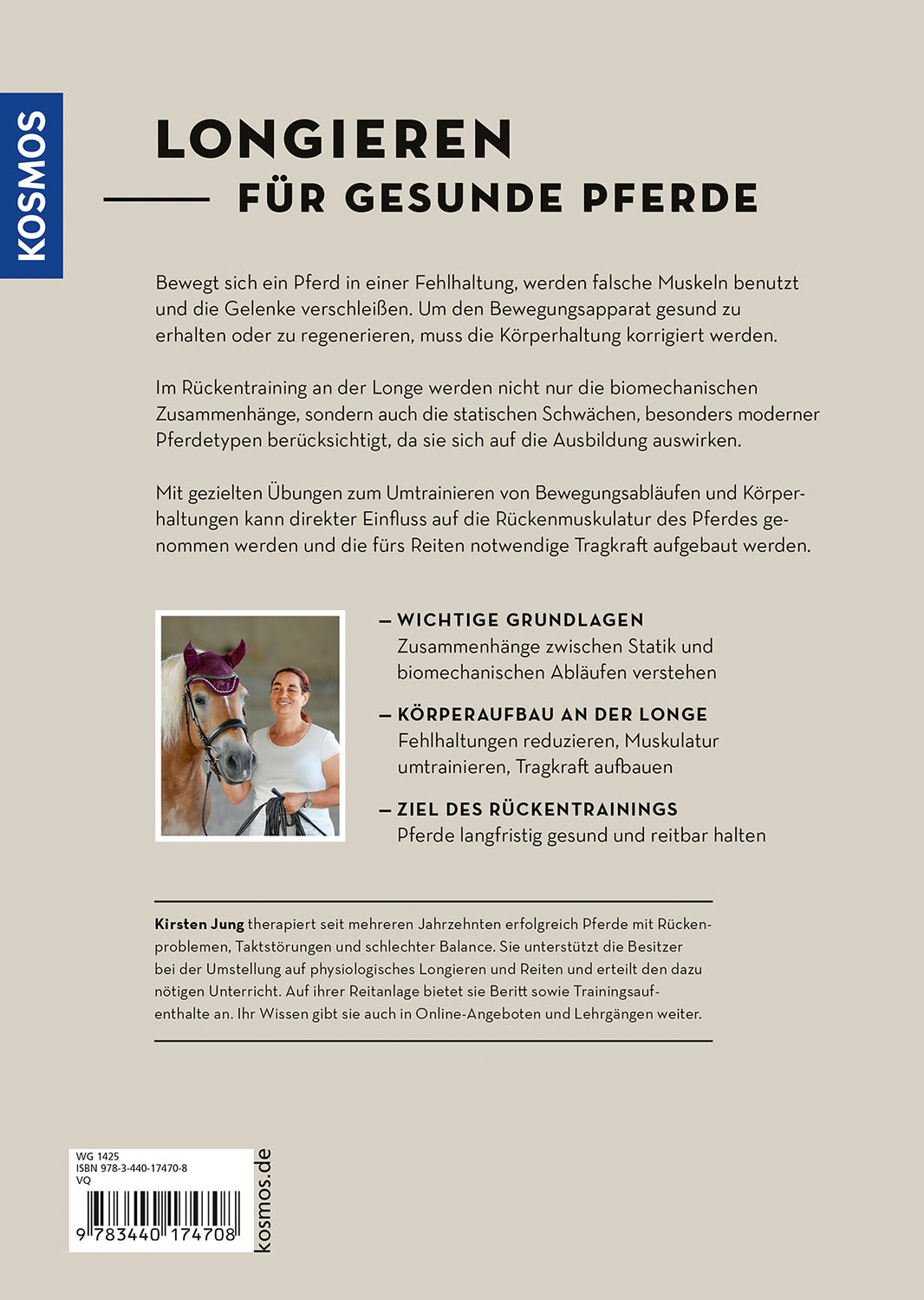 Bewegt sich ein Pferd in einer Fehlhaltung, werden falsche Muskeln benutzt und die Gelenke verschleißen vorzeitig. Besonders "moderne" Pferde sind aufgrund ihrer schlechteren Statik von diesen Problemen betroffen. Die Pferdetrainerin und Reha-Expertin Kirsten Jung zeigt, wie man durch Rückentraining an der Longe Bewegungsabläufe umtrainiert, schädliche Körperhaltungen korrigiert und die Tragkraft verbessert. In Schritt-für-Schritt-Anleitungen wird der Trainingsaufbau ausführlich beschrieben, damit jeder sein Pferd erfolgreich therapieren kann.