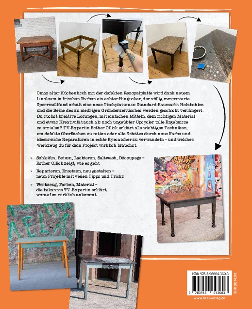 Omas alter Küchentisch mit der defekten Resopalplatte wird dank neuem Linoleum in frischen Farben ein echter Hingucker, der völlig ramponierte Sperrmüllfund erhält eine neue Tischplatte aus Standard-Baumarkt-Holzbohlenund die Beine des zu niedrigen Gründerzeittisches werden geschickt verlängert. Du suchst kreative Lösungen, mit einfachen Mitteln, dem richtigen Material und etwas Kreativität auch als noch ungeübter Upcycler tolle Ergebnissezu erzielen? TV-Expertin Esther Ollick erklärt alle wichtigen Techniken, um defekte Oberflächen zu retten oder alte Schätze durch neue Farbe und ideenreiche Reparaturen in echte Eyecatcher zu verwandeln - und welchesWerkzeug du für dein Projekt wirklich brauchst.Schleifen, Beizen, Lackieren, Saltwash, Découpage - Ester Ollick zeigt, wie es geht! Als gelernte Raumausstatterin und Expertin in der Sendung "Bares für Rares" zeigt dir unsere Autorin Esther Ollick, wie du aus ausrangierten Tischen echte Hingucker machen kannst. Wer hätte gedacht, dass in rustikalen Fifties-Tisch ein moderner Essplatz, in dem etwas faden Kellerfund ein hipper Tisch im angesagten Industrie-Look steckt? Gib deinen Tischen eine zweite Chance, anstatt sie zu entsorgen!"Nein, das muss nicht weg!" Nach dieser Devise lebt und arbeitet Esther Ollick. Mit einfachen Mitteln zeigt die sympathische TV-Expertin, wie aus einem sperrmüllreifen Möbelstück ein neues Statementpiece wird. In neun coolen Projekten werden mit zahlreichen und detaillierten Schritt-für-Schritt-Fotos alle wichtigen Techniken, Werkzeuge, Materialien, Farben, Tricks und Kniffe gezeigt, die dir helfen, Deinen Flohmarktfund "aufzumöbeln". Neben kurzen Infos zum Zustand, Upcyling-Idee und Designstil des jeweiligen Projekt-Tisches gibt es Informationen zu den Grundtechniken der Holzbearbeitung. Nutze dieses Buch, um selbst kreativ zu werden und deine eigenen, ganz einzigartigen Designertische zu erschaffen! Werde auch du zum Möbelretter und trage zur Schonung unserer Ressourcen bei!