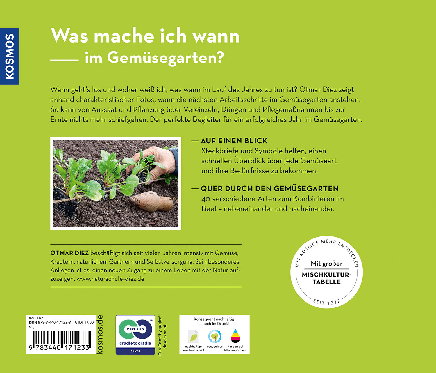 Wann dürfen die Karotten ins Freiland? Wie muss ich Tomaten ausgeizen? Und woran erkenne ich erntereifen Spinat? Dieser neue Ratgeber für Selbstversorger beantwortet jede Frage zur Gartenpraxis im Gemüsebeet anhand von detaillierten Fotos. Von Aussaat und Pflanzung bis zur Ernte wird auf den Fotos gezeigt, wie die Pflanze gerade aussieht und was im jeweiligen Stadium zu tun ist. Die anschaulichen, leicht verständlichen Anleitungen werden ergänzt durch eine übersichtliche Tabelle zu Mischkulturpartnern, Pflanzabständen und Kulturdauer. Der perfekte Begleiter, besonders für Einsteiger beim Gemüsegärtnern.KOSMOS - konsequent nachhaltig.Produziert nach dem zertifizierten Cradle-to-Cradle-Prinzip.